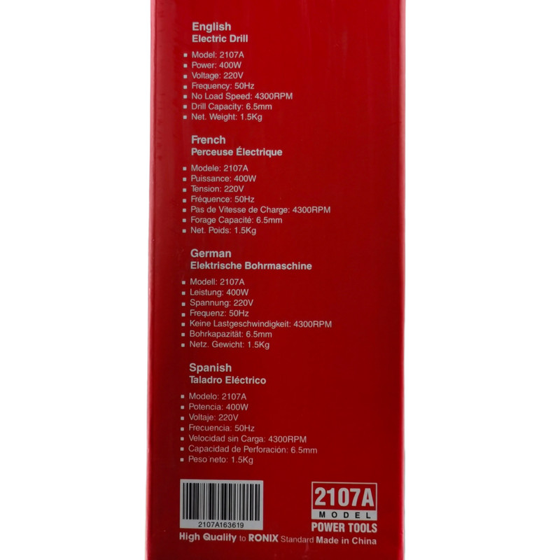 | سایر توضیحات | موتور قدرتمند 400واتی با کیفیت وبا طول عمر بالا با سرعت 4300دور در دقیقه دریلی کارآمد وخوش دست برای عملکرد عالی در سوراخکاری وپیچ بستن دارای بدنه کوچک وارگونومیک با وزن بسیار کم مناسب برای استفاده های طولانی مدت دارای سه نظام آچاری 6.5 میلی متری مستحکم دارای کلید گازی ضد غبار جهت تنظیم دقیق سرعت مته برای استفاده برسطوح مختلف مجهز به کلید دور متغیر با قابلیت راستگرد،چپگرد وضد غبار مطابق با استاندارد tuv |