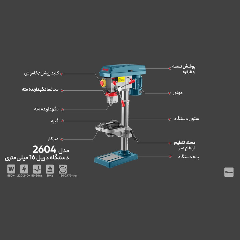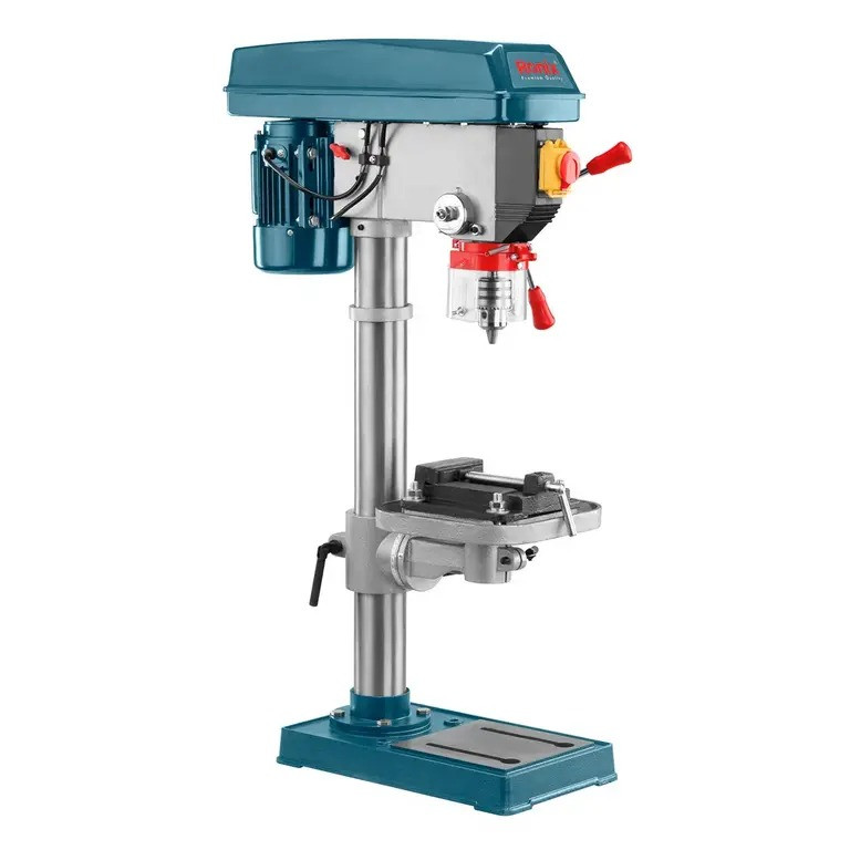 مجهز به موتور قدرتمند 550 وات بوده، عمود بر میز یا سطح زمین کارگاههای نجاری و صنعتی قرار میگیرد و به صورت ثابت یا رومیزی از آن استفاده میشود. این دریل، دقت بسیار بالایی را در عملیات سوراخکاری بر روی سطوح مختلف به کاربران ارائه میدهد.سرعت دریل ستونی به وسیله سیستم تسمه پولی در 16 دور مختلف قابل تنظیم است. سهنظام آچاری و قابل تنظیم این محصول با ظرفیت 3 تا 16 میلیمتر، متناسب با انواع متهها طراحی و ساخته شده است.ظرفیت سوراخکاری این دریل، 35 میلیمتر در چوب، 16 میلیمتر در آهن و 25 میلیمتر در پلاستیک میباشد.