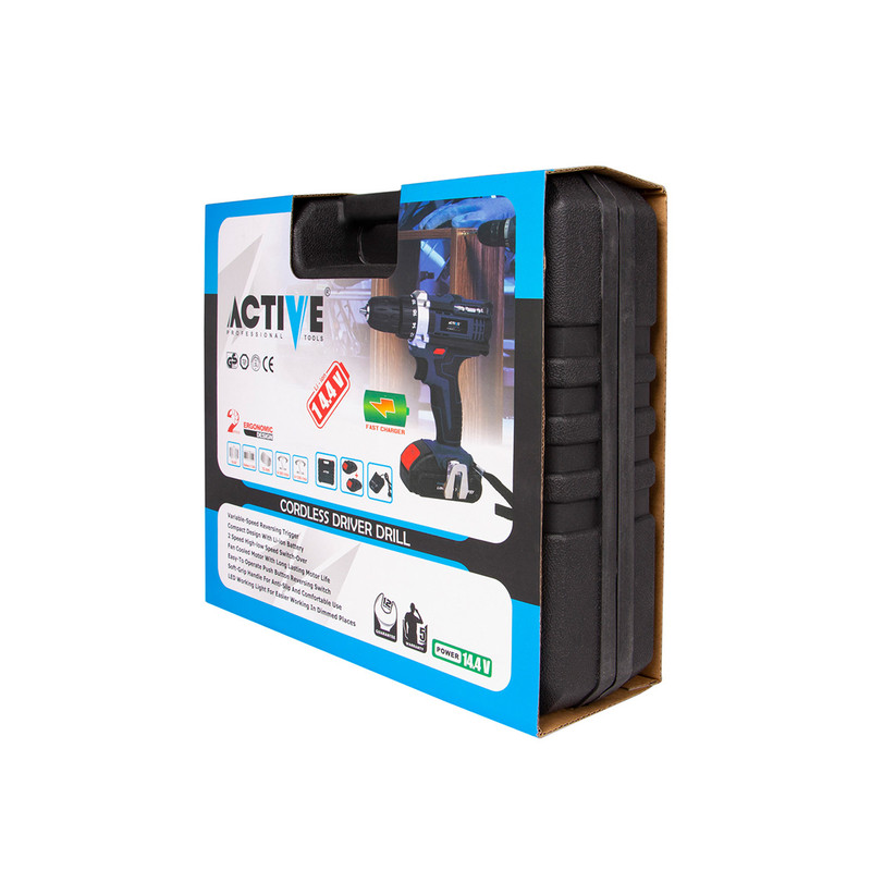 دریل شارژی14.4 ولت اکتیو دارای یک عدد باطری لیتیوم اضافه میباشد تا درصورت اتمام باطری نصب شده روی دستگاه، بلافاصله از باطری دوم استفاده شود و از اتلاف وقت کاربر جلوگیری شود. این دریل شارژی دارای شارژر سریع Fast Charge است که سرعت شارژ باطری به سریع ترین حد ممکن میرسد و زودتر از انواع شارژر های معمولی عمل شارژ را انجام میدهد. دریل شارژی14.4 ولت لیتیوم اکتیو دارای سه نظام اتوماتیک میباشد که دیگر نیازی به آچار جهت تعویض مته و یا سرپیچگوشتی نیست و این کار به راحتی بدون نیاز به آچار سه نظام انجام میشود. مکانیزم رفت و بازگشت،دسته نرم و ارگونومیک،دارای گیربکس فلزی صنعتی،سبک و پرقدرت،دارای چراغ LED جهت کار در محیط های تاریک نوع گيربکس : 2 حالته (دو سرعته) حداکثر گشتاور: 29 نيوتن بر متر تعداد گشتاور: 1+18 گشتاور