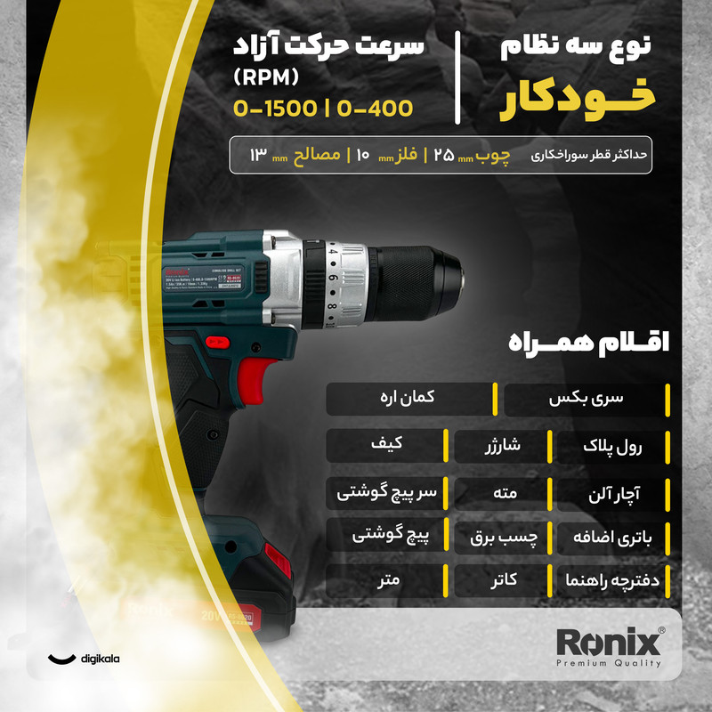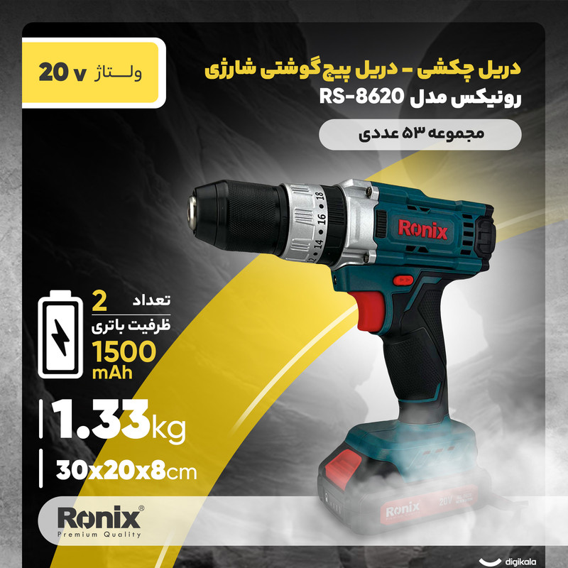 دریل شارژی رونیکس مدل RS-8620 ترکیبی از قدرت، کارایی و طراحی هوشمندانه است که برای انجام طیف وسیعی از کارهای خانگی و نیمهصنعتی (کارگاهی) طراحی شده است. این دریل چکشی و پیچگوشتی شارژی با تکیه بر منبع تغذیهی باتری قابل شارژ، آزادی عمل بالایی در فضاهای بدون برق فراهم میکند. وجود سهنظام خودکار با سایز ۱۰ میلیمتر، تعویض سریع مته و سریها را آسان کرده و دقت کار را افزایش میدهد.