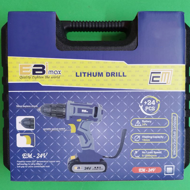 دریل شارژی 24 ولت ابی مکس مدل EM-24V یک ابزار قدرتمند و چندمنظوره با طراحی صنعتی و کیفیت ساخت بالا است که برای کارهای خانگی، نیمه‌حرفه‌ای و صنعتی طراحی شده. این مدل با دو عدد باتری لیتیوم 24 ولت و شارژر سریع، امکان استفاده مداوم و بدون وقفه را فراهم می‌کند.موتور دستگاه با سیم‌پیچی تمام مسی و تحمل دمایی تا 200 درجه و گیربکس دو سرعته،عملکردی پایدار و قابل کنترل در شرایط مختلف کاری ارائه می‌دهد. سرعت گردش در حالت بی‌باری از 0 تا 1500 دور در دقیقه است و حداکثر گشتاور آن به 30 نیوتن‌متر می‌رسد.سه‌نظام اتوماتیک 10 میلی‌متری با قابلیت تعویض ، امکان سوراخ‌کاری دقیق در مواد مختلف را فراهم می‌سازد: – ظرفیت سوراخ‌کاری در چوب: تا 25 میلی‌متر – ظرفیت سوراخ‌کاری در فلز و آلومینیوم: تا 10 میلی‌متر