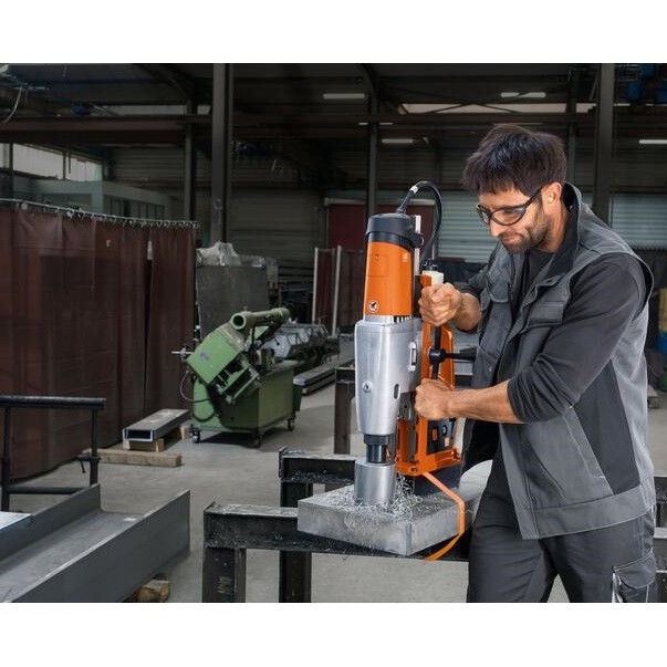 دریل مغناطیسی مدل KBU 110-4 M یک دریل مغناطیسی حرفه ای و صنعتی با مشخصات فنی خاص محسوب می گردد. طراحی و ساخت این دریل که تماما ساخت کشور آلمان بوده، جهت کار در شرایط سخت و مداوم است . امکان گردبری حرفه ای تا قطر 110میلیمتر (110میلیمتر با مته های الماسه و تا قطر 80میلیمتر با مته های HSS) در فلزات و دریل کاری سنتی تا قطر 40 میلیمتر را مهیا می سازد.دارای سیستم خنک کار – روان کار متصل با دستگاه می باشد به نحوی که مایع خنک کار – روان کار به واسطه نیروی وزن به صورت خودکار به محل انجام عملیات گردبٌری جاری خواهد شد و فقط در موارد استفاده به صورت افقی و یا بالای سر نیاز به استفاده از مایع روان کار – خنک کار به صورت دستی خواهید داشت. که امکان استفاده جهت کار مداوم، حرفه ای و با دقت بالا را فراهم ساخته و باعث می شود تا پس از گذشت زمان و استفاده مداوم از دستگاه، دقت آن کاهش نیافته و یا به لرزش نیافتد. ابزارگیر گرد بر Weldon 32 میباشد. این دریل قابلیت چرخش به صورت ساعت گرد و پاد ساعت گرد را دارد و بازه کل کورس این دریل مغناطیسی 400 میلیمتر بوده که به شما آزادی عمل زیادی در انتخاب ابزارهای دریل کاری خواهد داد. رابط کاربری دستگاه در راستای دید کاربر در حین انجام عملیات می باشد و همچنین این دستگاه به نمایشگر میزان چسبندگی مگنت مجهز است به نحوی که چراغ مگنت در شرایط عدم وجود نیروی کافی جهت نگه داشتن دستگاه به صورت چشمک زن در می آید. شرکت فاین (FEIN) در سال 1867 میلادی در شهر اشتوتگارت آلمان آغاز به کار و در سال 1895 اقدام به اختراع اولین دریل برقی دستی دنیا و در سال 1909 اولین دریل مغناطیسی دنیا را اختراع نمود. علی رغم گذشت 151 سال از شروع تولیدات شرکت فاین، این شرکت قویا به خاستگاه خود یعنی کشور آلمان متعهد بوده و تمامی محصولاتش را در Schwäbisch Gmünd کشور آلمان تولید می نماید.