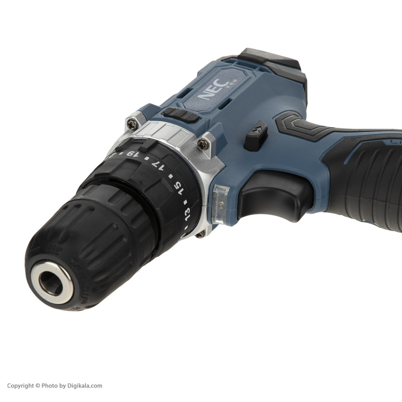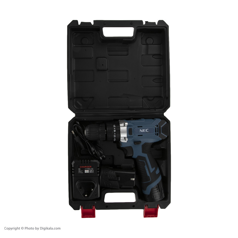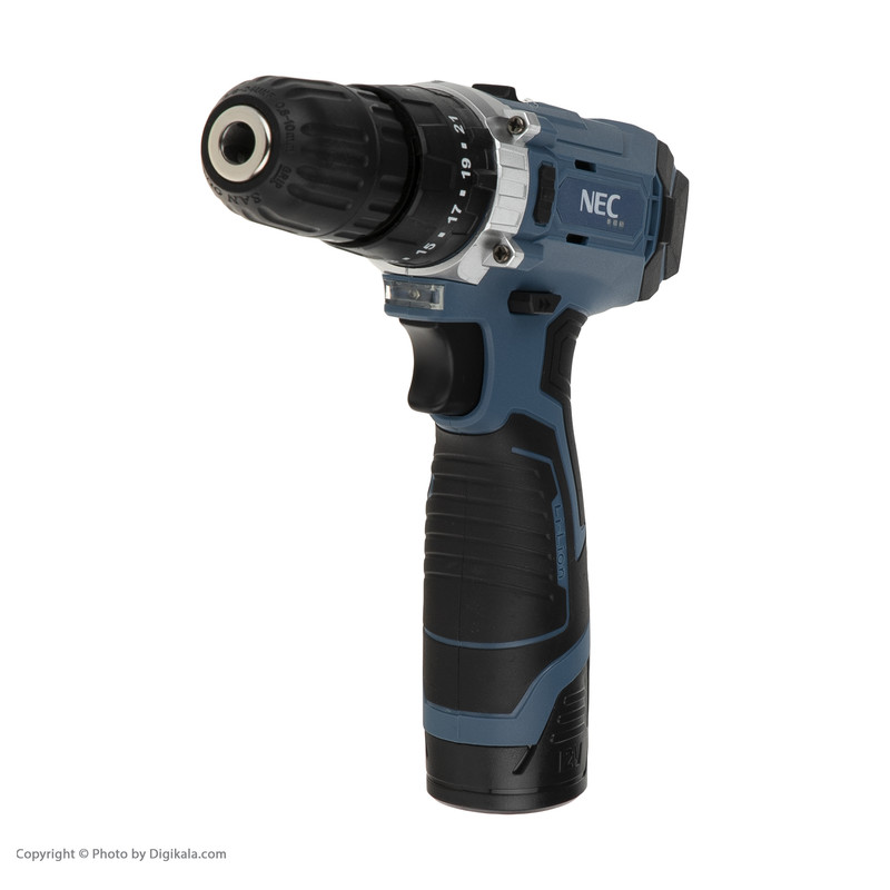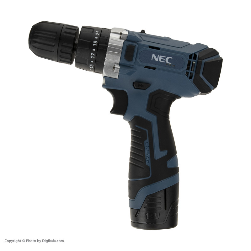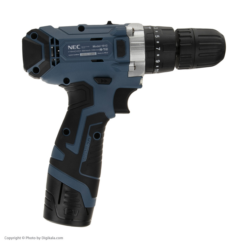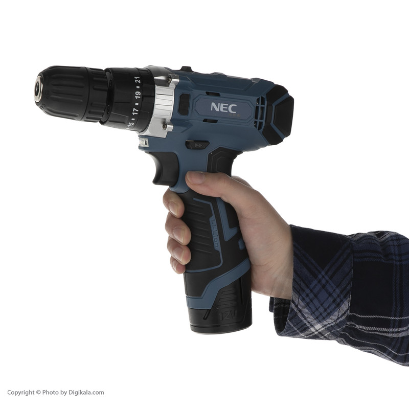 دستگاهی که در تصویر مشاهده میکنید توسط شرکت معتبر ان ای سی (NEC) تولید میشود. با کمک این دستگاه میتوان فرایند سوراخکاری و باز و بسته کردن پیچها را به خوبی انجام داد. این دستگاه مدل (NEC 1812) نام دارد و در گروه دستگاههای شارژی قرار میگیرد. محصول فوق نیروی خود را از طریق یک باتری 12 ولتی تامین میکند. این باتری از نوع لیتیوم بوده و ظرفیتی برابر 1.5 آمپر ساعت دارد. سرعت گردش این دستگاه قابل تنظیم است و کاربر با تغییر میزان فشار انگشت خود روی شستی میتواند آن را تغییر دهد. این سرعت در دو بازهی 350-0 و 1350-0 دور بر دقیقه قرار دارد. سرعت اول برای باز و بسته کردن پیچ مورد استفاده قرار میگیرد و سرعت دوم برای انجام سوراخکاری مناسب است. یکی از نقاط قوت این دستگاه حالت ضربهای دریل آن است. این حالت در سوراخکاری سطوح سخت، به کاربر کمک زیادی میکند . سه نظام به کار رفته در ساخت این دستگاه از نوع 10 میلیمتری خودکار بوده و حداکثر قطر سوراخکاری آن در چوب، فلز و مصالح به ترتیب برابر 18، 10 و 10 میلیمتر است. این دریل پیچگوشتی دارای لامپی ال ای دی بوده که موجب روشن شدن سطح مورد نظر میشود. دستهی محصول فوق به شکلی ارگونومیک طراحی شده و به روکشی ضد لغزش مجهز است.