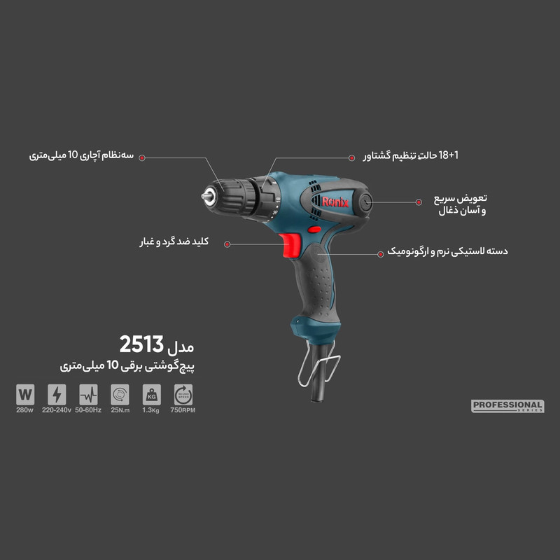 مجهز به کلیدهای ضد غبار جهت ممانعت از ورود گرد و غبار به داخل دستگاه؛ کلید گازی کنترل سرعت؛ کلید چپگرد راستگرد؛ کلید تنظیم سرعت در دو حالت میباشد .