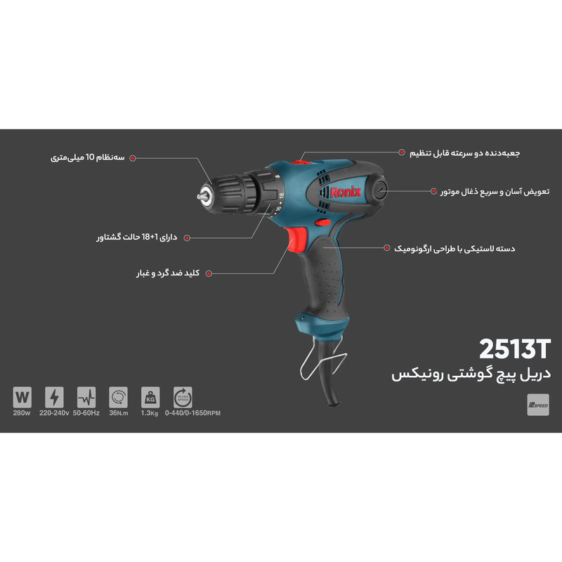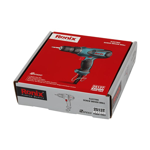 پیچ گوشتی برقی رونیکس مدل 2513T یکی از انواع دریلهای شرکت رونیکس میباشد که با کابل 3 متری و ولتاژ برق شهری کار میکند و اغلب جهت باز و بسته کردن انواع پیچها مورد استفاده قرار میگیرد. پیچ گوشتی برقی رونیکس مدل 2513T دارای توانی معادل 280 وات بوده و مجهز به گیربکس صنعتی قابل تنظیم در گشتاورهای متفاوت جهت پیچ کاری و همچنین استفاده از بلبرینگهای ضد غبار مطابق با استاندارد TUV میباشد.