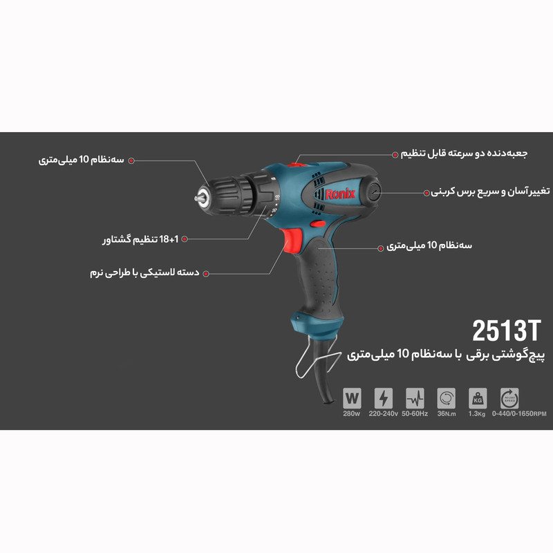 شرکت رونیکس با ارائه دریل پیچ گوشتی برقی رونیکس مدل 2513t این مساله را تا حد زیادی رفع کرده است. این دریل پیچ گوشتی برقی فقط 1.3 کیلوگرم وزن دارد و با کمک کابل بلند 3 متری و منطعف خود این امکان را به شما میدهد تا به راحتی ابزار را حمل کرده و نگه دارید. به طور کلی طراحی ارگونومیک این پیچگوشتی برقی و بدنهی ضد ضربهی آن، باعث کمتر شدن فشار ضربات شده و شما به عنوان کاربر، فشار کمتری را متحمل شوید.برتری دریل پیچ گوشتی برقی رونیکس مدل 2513t، در موتور قدرتمند آن است؛ این موتور با طراحی مدرن خود که استاندارد CE اروپا را دارد، تا 1650 دور در دقیقه توان گردش دارد. گیربکس دو سرعتهی این دریل با ترکمتر 1+18حالته، این امکان را به شما میدهد تا در حین کار بتوانید قدرت و سرعت مدنظر خود را انتخاب کنید. ویژگی دیگر این دریل پیچگوشتی برقی، بلبرینگهای ضد غبار منطبق با استاندارد TUV است.