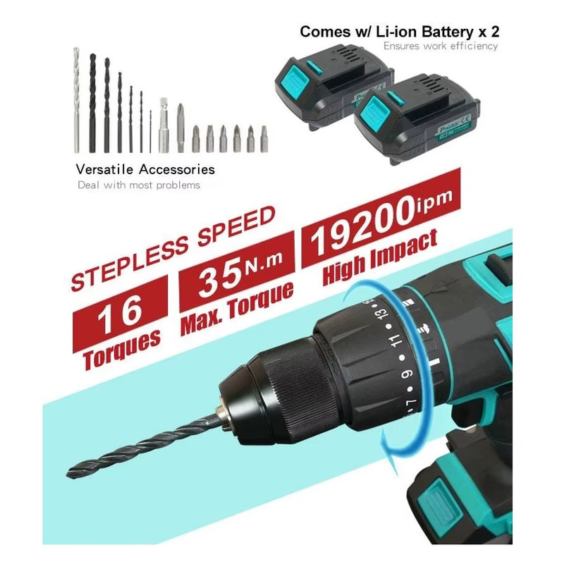 • ویژگی‌های دریل: سیستم گردش چپ‌گرد، سیستم گردش راست‌گرد، قابلیت کنترل سرعت، قفل سوییچ، سیستم ضربه زن