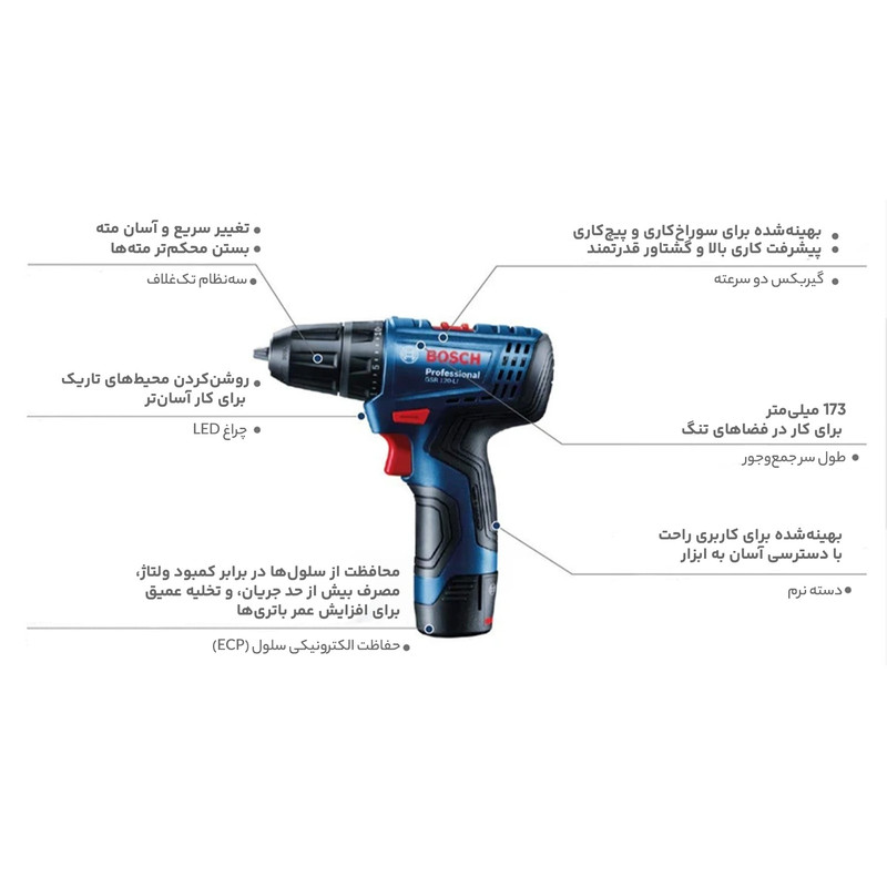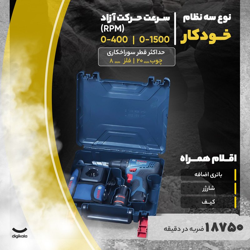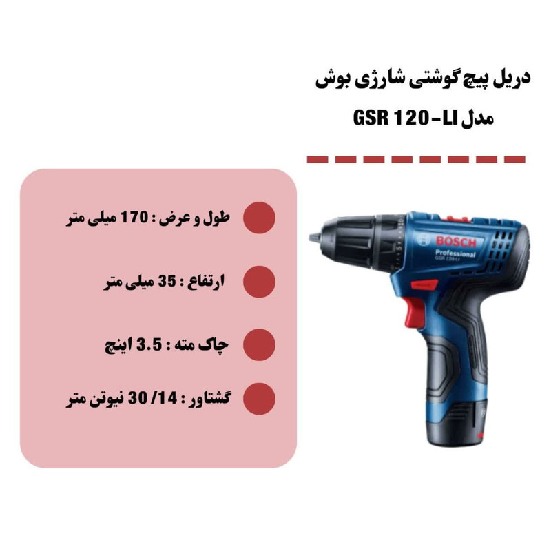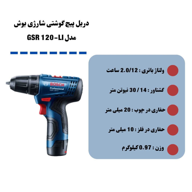 عملکرد دریل پیچگوشتیهای شارژی ترکیبی از دو دستگاه دریل و پیچگوشتی شارژی است. این دستگاهها میتوانند با توجه به سرعت چرخش تبدیل به یک دریل شوند یا مانند پیچگوشتی شارژی برای پیچاندن پیچها مورد استفاده قرار گیرند. محصول فوق یکی از تولیدات شرکت «بوش» (Bosch) بوده که تحت عنوان مدل «GSR 120-LI» به بازار عرضه میشود. این دستگاه از گشتاور مناسبی برخوردار بوده و قدرت خوبی دارد. گشتاور این محصول در بیشترین حالت 30 نیوتنمتر اعلام شده است. قابلیت تنظیم گشتاور از دیگر مزایای این دریل پیچگوشتی شارژی است. برای این منظور میتوان میزان گشتاور دستگاه را در 1+20 حالت مختلف تغییر داد. از گشتاورهای بالا معمولا برای کار روی سطوح سخت و مقاوم استفاده میشود و گشتاورهای پایین برای انجام کارهای سبک و ظریف کاربرد بیشتری دارد. در این دستگاه میتوان سرعت چرخش را نیز همچون میزان گشتاور کنترل کرد. برای این منظور یک شستی دیمردار روی دستگاه تعبیه شده است که با کمک آن کاربر میتواند سرعت چرخش را با تغییر میزان فشار انگشت خود تغییر دهد. سرعت چرخش این دستگاه در دو بازهی 0 تا 300 و 0 تا 1300 دور بر دقیقه قابل تنظیم است. این دستگاه انرژی مورد نیاز خود را از باتری لیتیوم یونی تامین میکند و برای این منظور به دو باتری 12 ولتی با ظرفیت 1.5 آمپرساعت مجهز شده است. در ساخت این محصول از سهنظام خودکار 10 میلیمتری استفاده شده است. برای نصب مته یا سری پیچگوشتی روی این سهنظام نیازی به آچار ندارید و این کار تنها با نیروی خود دستگاه و نگه داشتن سهنظام با دست انجام میشود.
