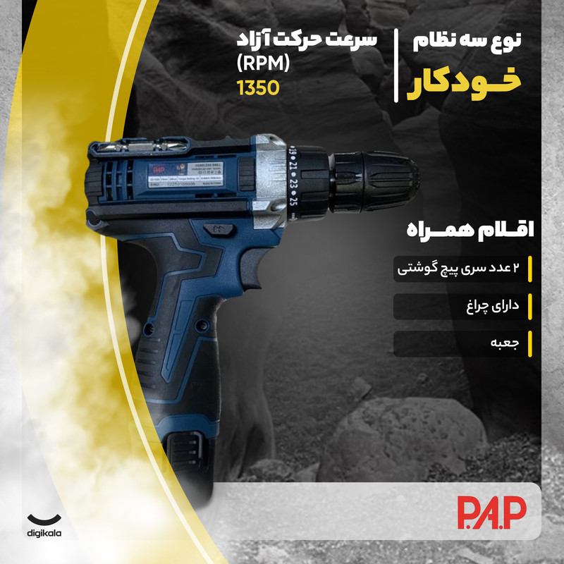 پیچ گوشتی شارژی پی ای پی محصول کشور چین بوده که از کیفیت بالا در تولید این ابزار به کار رفته که در جعبه آن یک عدد باطری لیتیومی 12 ولت ، شارژر ، سری پیچ گوشتی چهارسو و دفترچه راهنما میباشد