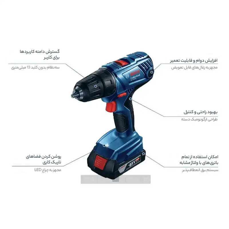 دریل بوش مدل GSR 180 LI – 2 عدد باطرى GBA 18 ولت 2.0 آمپر – دارای شارژر GAL 18V-20 – دارای گشتاور 21/54 نیوتن متر – ظرفیت سه نظام: 1.5 تا 13 میلی‌متر