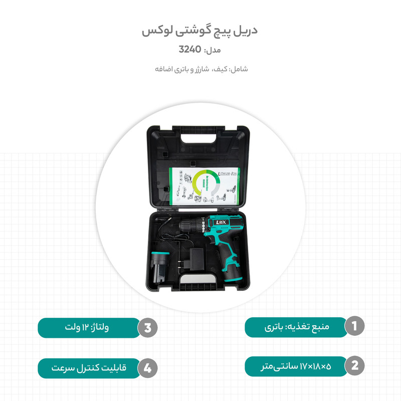 - ویژگیهای دریل: سیستم گردش چپگرد، سیستم گردش راستگرد، قابلیت کنترل سرعت