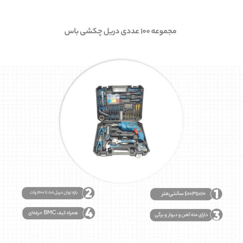 | سایر توضیحات | ✔ این مجموعه دارای پکیجی ابزاری 100 عددی جهت امور خانگی و اداری و تعمیرات خانگی می باشد ✔ این مجموعه دارای دریل 850 وات چکشی، دارای دیمر و چپگرد و راستگرد می باشد ✔ دارای کلیه ابزارهای مصرفی شامل؛ آچار فرانسه سایز8، انبردست، دمباریک، چکش، بکس تک سایز 4 تا 13، متر 3 متری، پیچ گوشتی دوسو و چهارسو سایز بزرگ، پیچ گوشتی نوک خور، مته آهن سایز 5 و 6 و 8، مته دیوار سایز 5 ،6 و 8، مته برگی سایز 12 و 16، 9 عدد نوک پیچ گوشتی، تبدیل نوک پیچ گوشتی به بکس چسب برق، کاتر، فازمتر دیجیتال، آچار سه نظام، 5 عدد تیغ کاتر، دو سایز پیچ گوشتی موبایلی دو سو و دو سایز پیچ گوشتی موبایلی چهارسو، کمان اره چوب و فلز، مجموعه سایزبندی پیچ و رولپلاک ✔ مجموعه ای کارا و مناسب جهت امور خانگی ✔ همراه کیف BMC حرفه ای |