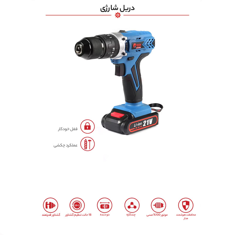 | سایر توضیحات | شارژی چکشی21 ولت ادون LV3-2110 دارای باتری 21 ولت دو آمپر دارای قدرت 35 نیوتون بر متر دارای گیربکس 2 حالته قدرتی و سرعتی دارای سه نظام 10 میلیمتر اتومات دارای ترکمتر 18 حالته دارای کیف حمل ضد ضربه اماکان کنترل سرعت گازی (فشاری) سیستم گردش چپ گرد و راست گرد دارای مته آهن و مته چوب (سایز 4 و 5 و 6 میلی متر ) دارای بکس سایز 5 تا 13 میلی متر دارای سه عدد نوک پیچ گوشتی دوسو ، سه عدد چهارسو به همراه رابط فنر تاشونده – رابط فنری تا شونده دارای تبدیل بکس خور سر دریلی سایز1/4 – دو عدد باتری -شارژر و گیره کمری |
