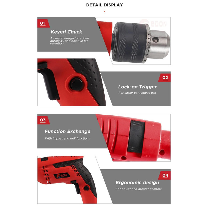 | سایر توضیحات | داراي کلید حالت دریل کاری ساده، چكشي براي استفاده در سطوح سخت مجهز به دسته جانبي گردان 360 درجه ارگونوميك كنترل سرعت گردش با ميزان فشار به شستي داراي دكمه قفل كن كليد در وضعيت روشن داراي کلید چپ گرد، راست گرد کابل برق 1.5 متری به همراه آچار سه نظام،خط کش تنظیم عمق،دسته کمکی |