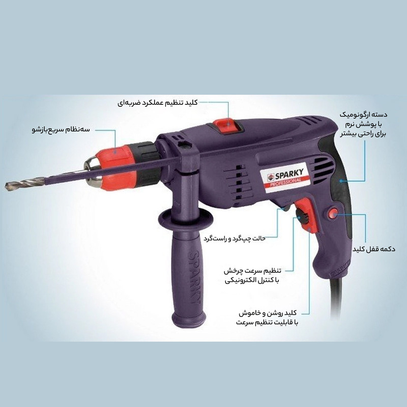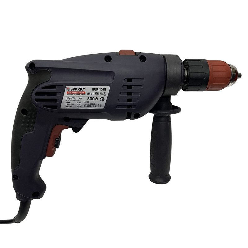 دریل چکشی اسپارکی مدل BUR131E با موتور پرقدرت 600 وات توان مناسب ترین گزینه برای استفاده خانگی و کارگاهی است. این دریل با قابلیت تنظیم سرعت (دیمردار) و همچنین دو حالت دریل و دریل چکشی برای سوراخ کاری دیوار و فلزات مناسب است. این دستگاه دارای کلید فشاری است به این معنا که سرعت چرخش دریل به میزان فشار بر کلید رابطه مستقیم دارد. سه نظام دستگاه اتومات است و نیازی به آچار برای محکم کردن مته ندارد. همچنین سه نظام دارای قفل کن است که از رها شدن مته در حین کار جلوگیری میکند.