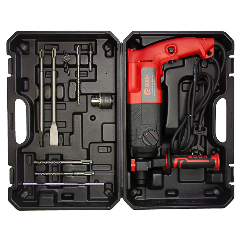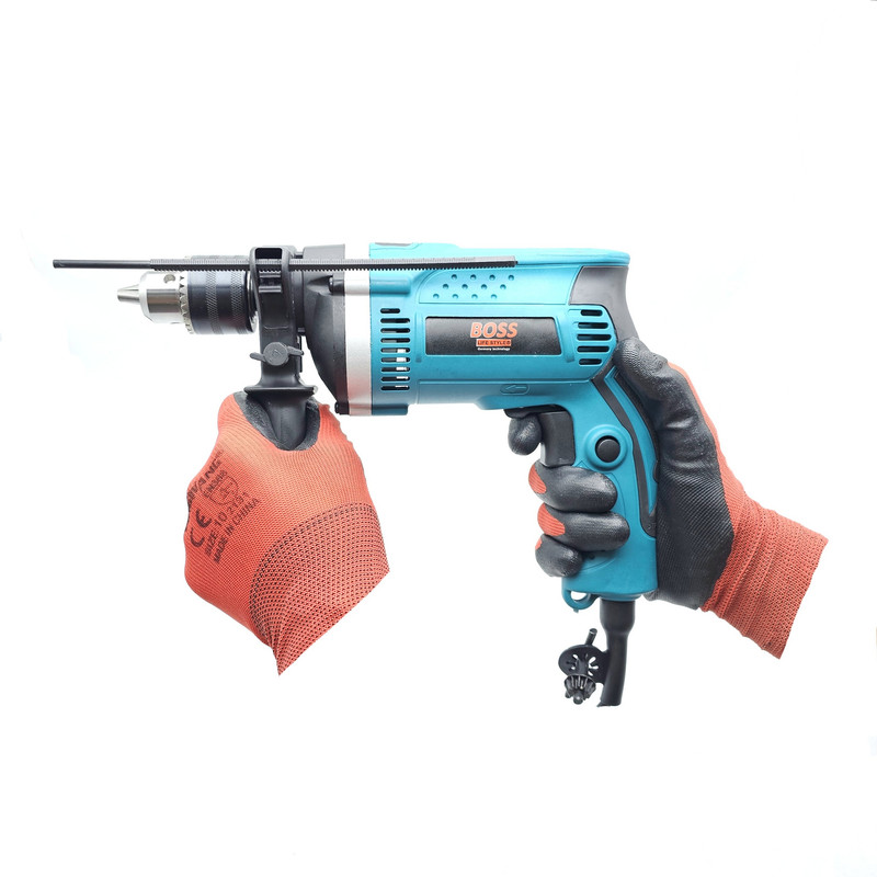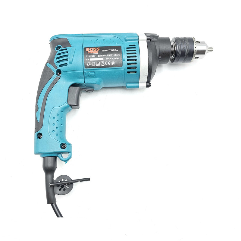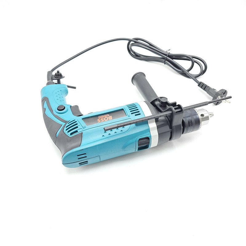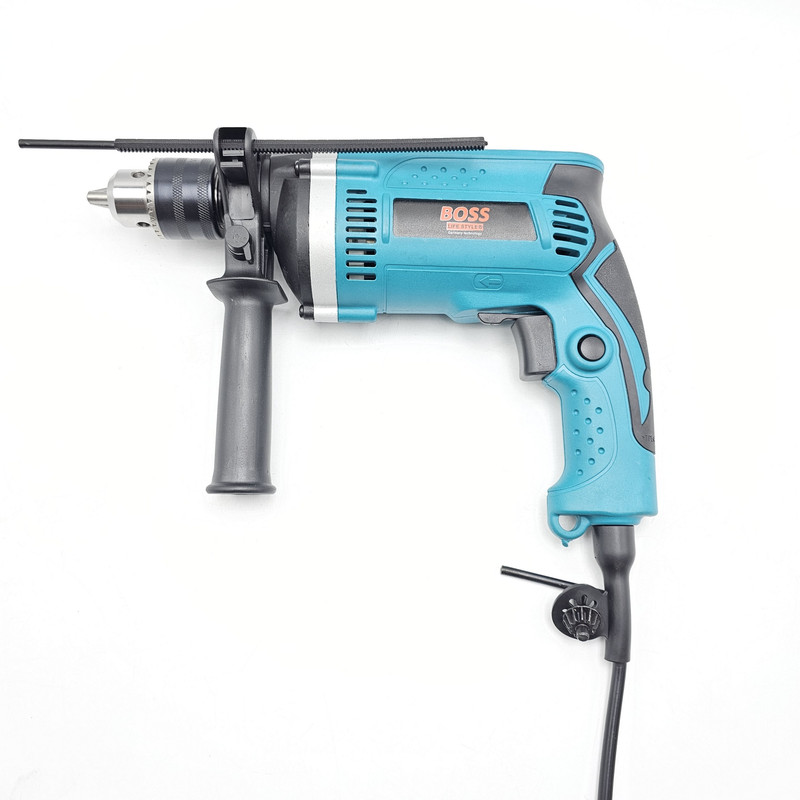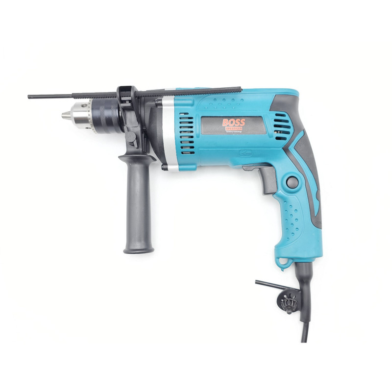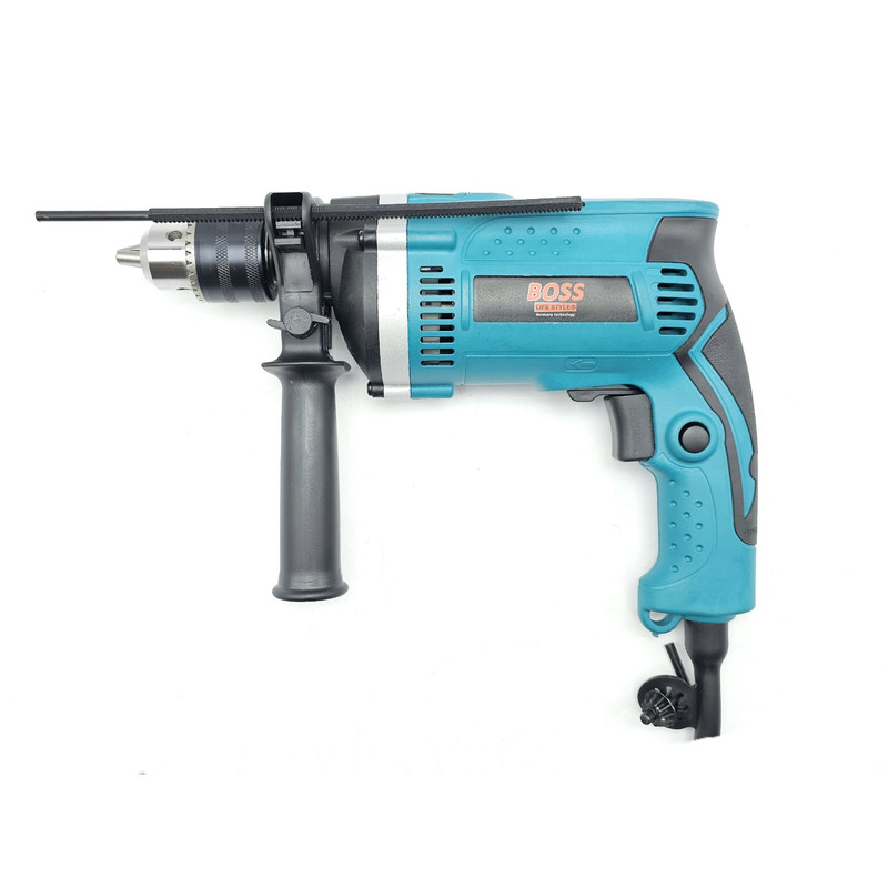 دریل چکشی نیم تنه فلزی باس که یکی از انواع ابزار های برقی دریل چکشی هستند که از آنها برای سوراخ کاری و پیچکاری استفاده می شود. مکانیزم کار در این ابزار به گونه ای است که از طریق چرخش مته در سرعت بالا می توان سوراخ کاری را انجام داد. در این دریل ها علاوه بر چرخش می توان از حالت چکشی یا ضربه هم استفاده کرد. دریل چکشی در اصل یکی از انواع دریل ها هستند که کاربرد وسیع تری نسبت به دریل های معمولی دارد و از آنها می توان در سوراخ کاری سطوح سخت و بتنی و گچی و سنگ و سرامیک و … استفاده کرد. دریل چکشی باس علاوه بر قابلیت سوراخ کاری به صورت چکشی با قطر و عمق بیشتر، در سوراخ کاری بتن و مصالح ساختمانی کاربرد بیشتری دارد، همچنین قابلیت پیچ کاری، به خصوص پیچهای خودکار MDF و چوب را هم داراست. یکی دیگر از از دیگر مزایای این دستگاه قابلیت استفاده بجای آچار بکس در صورت مهیا بودن تبدیل بکس و سبک بودن کار است. با وجود اینکه قابلیت دریل چکشی در سوراخ کاری بالاتر است اما دریل چکشی باس به دلیل سرعت بالاتر و همچنین تمرکز نیرو برای سوراخ کاریهای دقیقتر و کیفیت سطوح بالاتر، گزینه مناسبتری است. دریل BOSS ابزاری است الکتریکی، که برای سوراخ کردن سطوح به کار میرود. دریل را با توجه به قدرت آن و نیز با استفاده از مَتّه مناسب، می توان برای سوراخ کردن چوب، فلز و بتن به کار برد. با پیشرفت ابزارها، امروزه نه تنها برای سوراخکاری، بلکه با اضافه کردن قطعاتی دیگر، میتوان امکاناتی مانند ساییدن، گردبر، عمودبر و… را هم به این دستگاه اضافه کرد. این دریل برای کارهای خانگی ، کارگاهی،تعمیرگاهی،ساختمانی و نصب و مونتاژ استفاده می شود.
