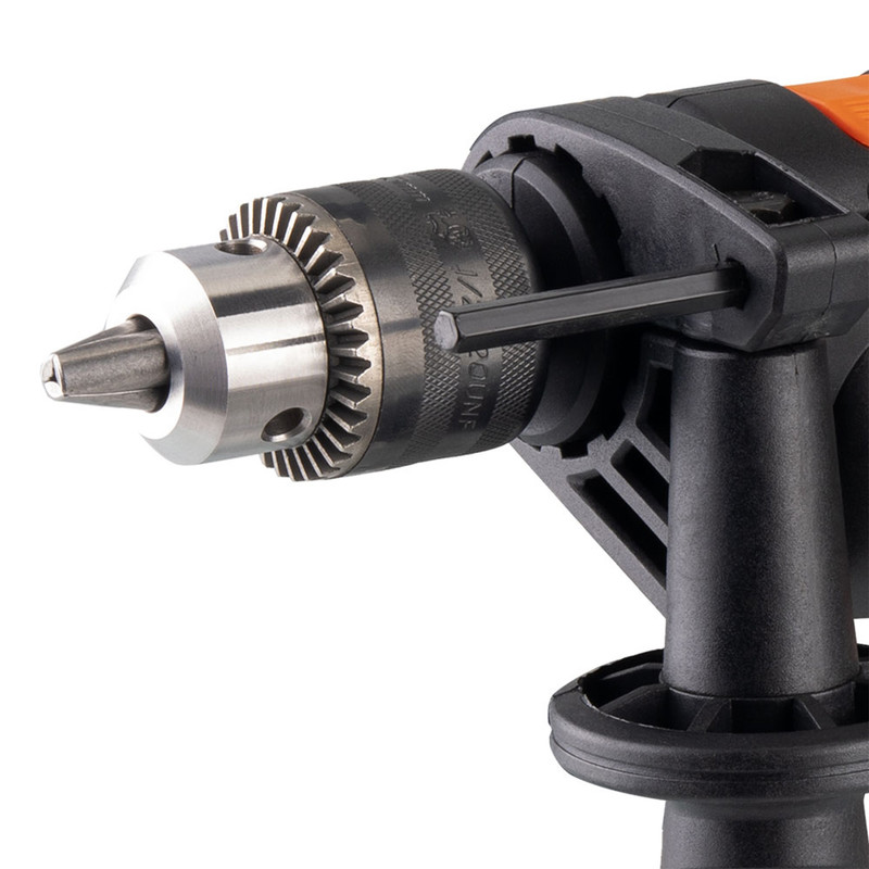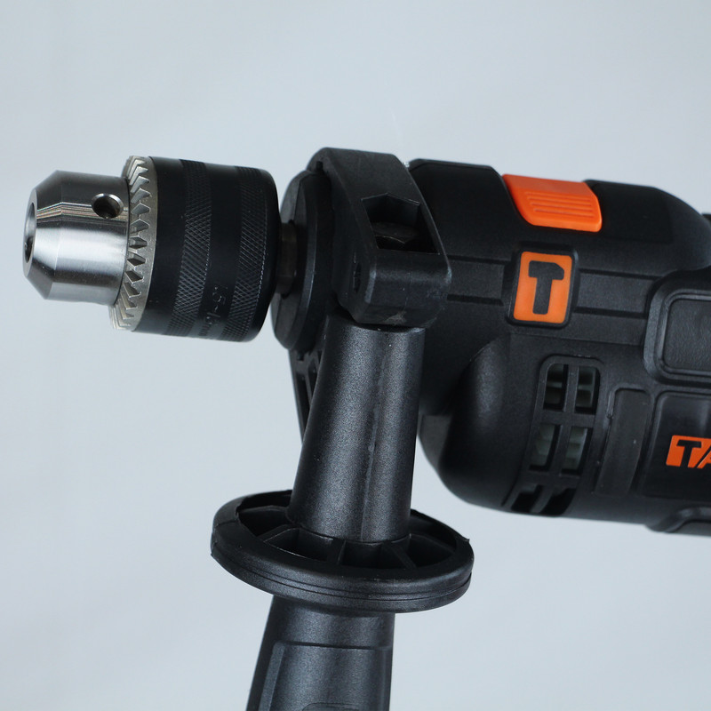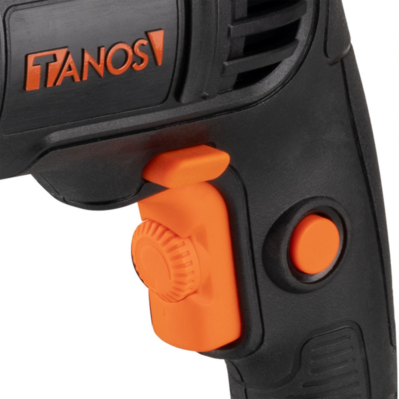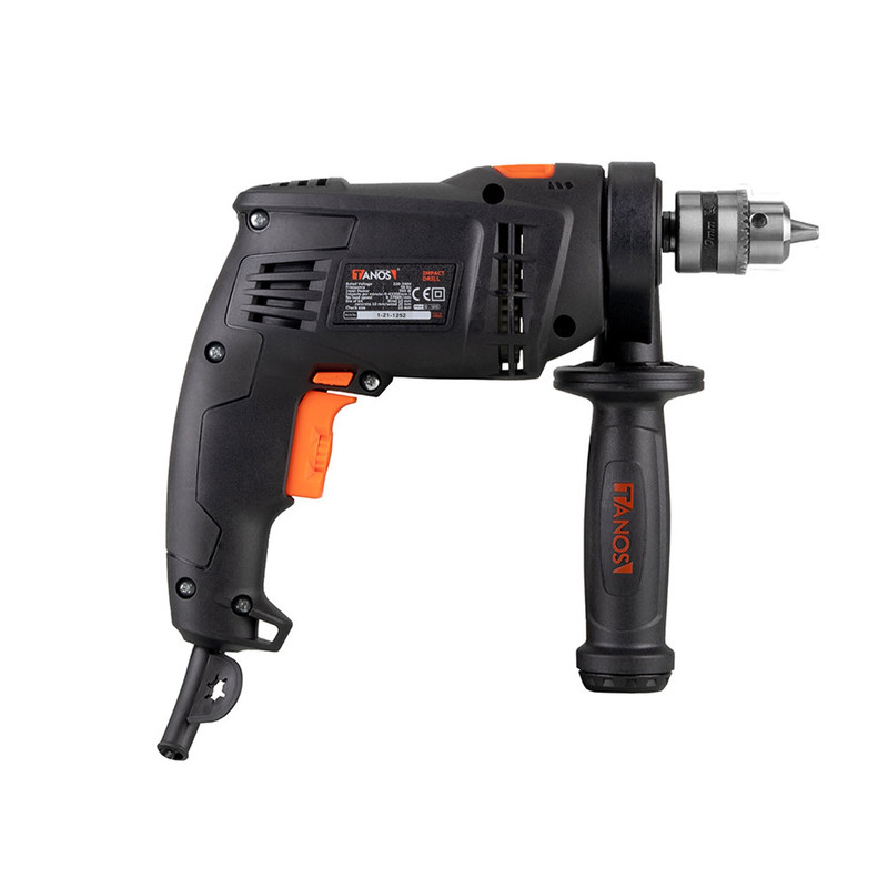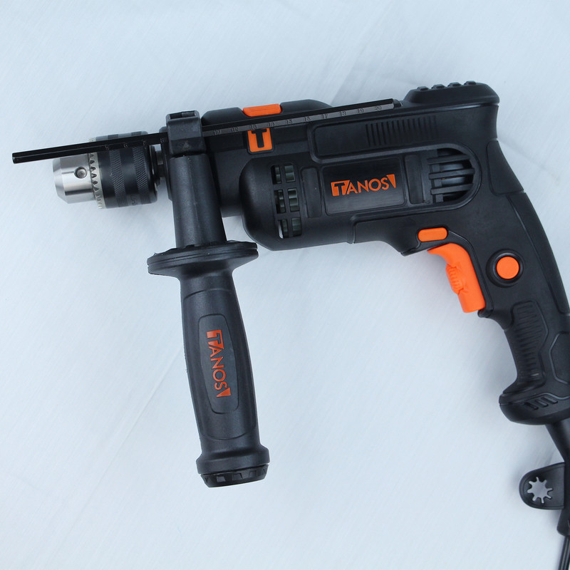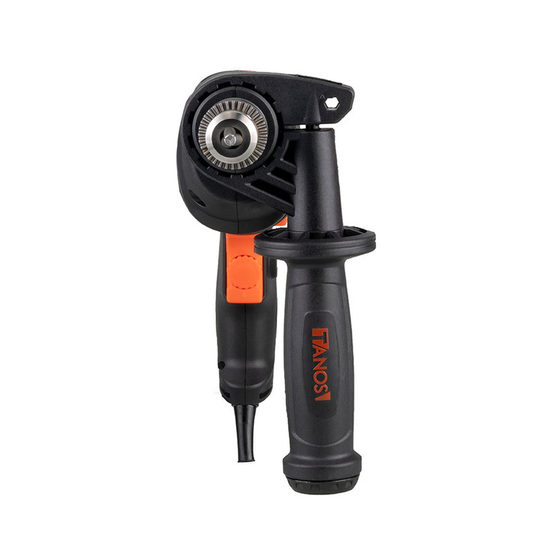 با استفاده از دریلهای چکشی علاوه بر سوراخ کردن چوب،پلاستیک فلزات، می توانید دیوار، سرامیک و انواع مصالح ساختمانی را نیز سوراخ کنید. دریل چکشی 750 وات مجهز به دیمر تنظیم سرعت شرکت تانوس کد 1375 ابزاری مناسب برای سوراخکاری در انواع سطوح چوبی و فلزی است.توان خروجی این دریل 750 وات است و با ولتاژ ورودی 220 ولت کار میکند و بیشینه سرعت دوران این دریل 3000 دور بر دقیقه است..این محصول از مکانیزم چرخشی بهره میبرد و دارای کلید چپ گرد و راست گرد مجزا میباشد که میتواند در دو جهت چرخش کند. برای سهولت در سوراخکاری، از یک دسته ارگونومیک در قسمت جلوی دستگاه استفاده شده است.سه نظام این دستگاه به صورت اتوماتیک است و دارای کلیدی دستی برای قفل کردن میباشد.اقلام همراه این دستگاه خطکش فلزی عمق سنج ، دسته جانبی دورانی، زغال،آچار سه نظام و دفترچه راهنمای فارسی است. طول کابل این محصول نیز 2.7 متر است.