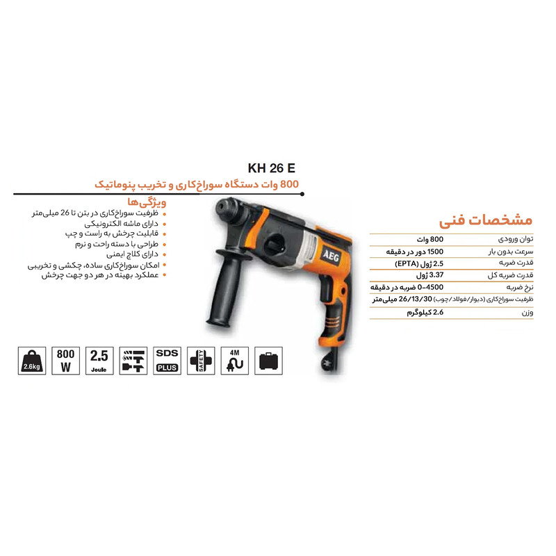 | سایر توضیحات | – قابلیت دریل تا 26 میلیمتر در بتون – امکان غیرفعالسازی حالت چرخش – امکان سوراخ کردن چوب و فلز – دسته نرم و راحت – مکانیزم رفت و بازگشت – انرژی هر ضربه: 2.5 ژول |