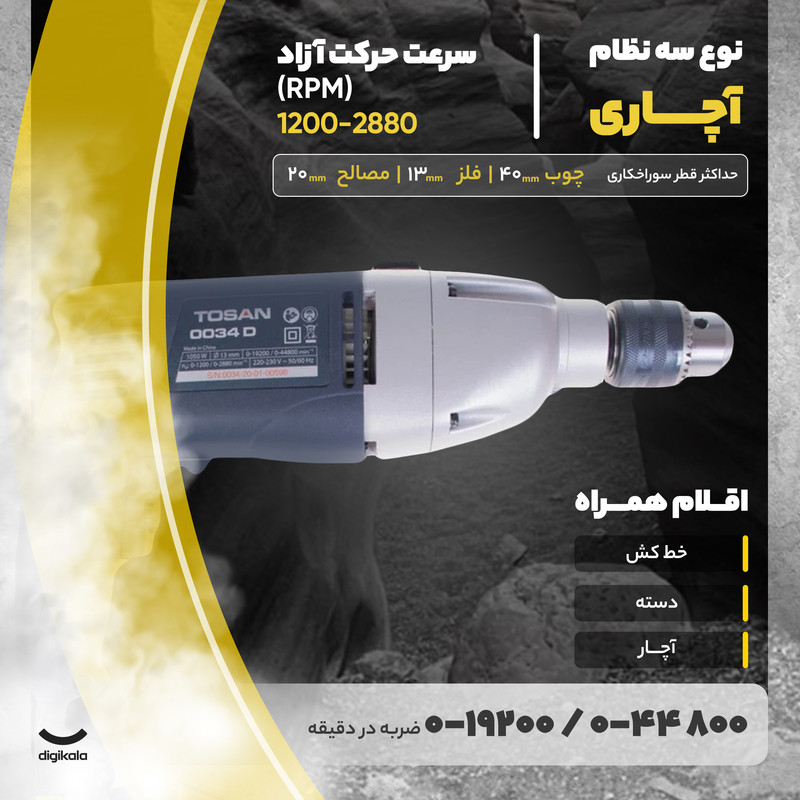 - ویژگیهای دریل: سیستم گردش چپگرد، سیستم گردش راستگرد، قابلیت کنترل سرعت، قفل سوییچ، سیستم ضربه زن