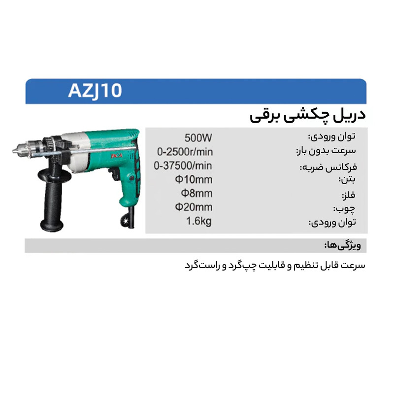 - ویژگیهای دریل: سیستم گردش چپگرد، سیستم گردش راستگرد، قابلیت کنترل سرعت، قفل سوییچ