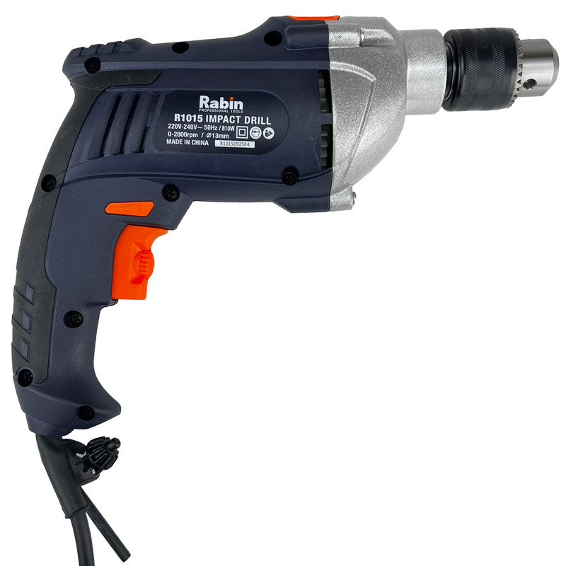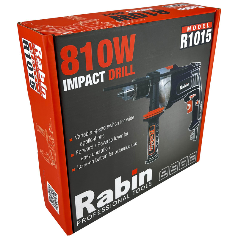 دستگاه فوق یکی از محصولات شرکت رابین بوده که علی رغم کیفیت بالای خود ازقیمت مناسبی برخوردار است.اگر قصد تهیهی یک دریل چکشی مناسب با قدرتی قابل قبول دارید، میتوانید از دستگاه فوق استفاده کنید. این دریل از توانی برابر 810 وات برخوردار است و از قابلیت کنترل سرعت گردش سود میبرد. میزان سرعت گردش این دستگاه توسط کلیدی چرخشی که روی شستی قرار دارد تنظیم میشود. بازهی سرعت چرخش این دستگاه 2800-0 دور بر دقیقه است. از دیگر مزایای این دستگاه میتوان به قابلیت چرخش ساعتگرد و پادساعتگرد آن اشاره کرد.این دستگاه دارای بدنه نیمه فلزی بوده و سه نظام این دریل چکشی از نوع 13 میلیمتری آچارخور بوده که حداکثر قطر سوراخکاری آن در چوب، فلز و مصالح به ترتیب برابر 30، 13 و 16 میلیمتر است. با کمک این دستگاه میتوانید با دقت و تسلط بیشتری به کار خود بپردازید که این ویژگی به دلیل وجود دستهی کمکی و قفل سوییچ این دریل حاصل شده است. این دسته قابل تنظیم بوده و از قابلیت چرخش 360 درجه سود میبرد. دستگاه فوق با نام (R1015 ) شناخته میشود و یکی از تولیدات شرکت «رابین» (RABIN) است.