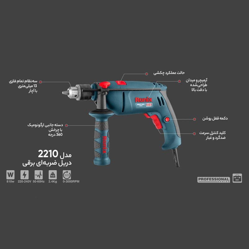 | سایر توضیحات | مجهز به موتور پرقدرت صنعتی با توان 810 وات برای بیشترین بهره وری در حالت عادی و چکشی -استفاده از سیستم بلبرینگی دوبل در قسمت شفت جهت اثر بخشی بالا حین سوراخکاری ضربهای و طول عمر کارکرد -دارای سه نظام آچاری تمام فلزی و مستحکم -مجهز به دسته گردان ارگونومیک 360 درجه -دارای قابلیت چرخش مته به صورت چپگرد و راستگرد – دارای کلید الکترونیک دیمردار ضد غبار جهت تنظیم دقیق سرعت مته برای کار روی سطوح مختلف -مجهز به مخزن نگهدارنده مته تعبیه شده در دسته جانبی و میله تنظیم عمق |