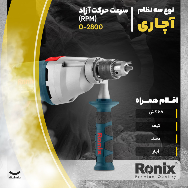 دریل چکشی مدل 2220 شرکت رونیکس است که علاوه بر قدرت مناسب در حالت چکشی، بهصورت معمولی نیز میتوان از آن استفاده کرد. این مدل با ابعاد 22 × 7 × 34 سانتیمتر و وزن 3.7 کیلوگرمی تولیدشده است. دارای قابلیت کنترل سرعت و با دو حالت در سرعت گردش به میزان 0-1100 یا 0-2800 دور بر دقیقه گردش میکند که جهت این گردش با انتخاب شما بهصورت چپگرد یا راستگرد خواهد شد. این دریل با برق 230 ولت و قدرت 1050 وات برای کارهای صنعتی نیز مناسب است. حداکثر قابلیت سوراخ در مصالح، چوب و فلز به ترتیب 16، 30 و 13 میلیمتر است طراحی ارگونومیک، یک دسته کمکی باقابلیت گردش 360 درجه و کابل برق 3 متری کمک بیشتری برای سهولت کار و انتخابی مناسب برای خرید شما است.