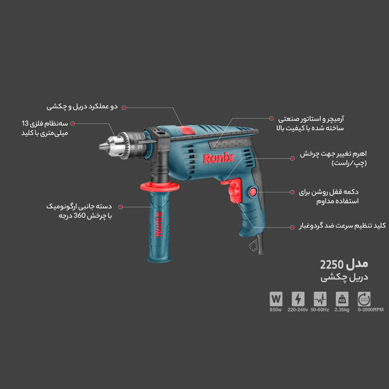 | ویژگیهای دریل | سیستم گردش چپگرد، سیستم گردش راستگرد، قابلیت کنترل سرعت، قفل سوییچ، سیستم ضربه زن |