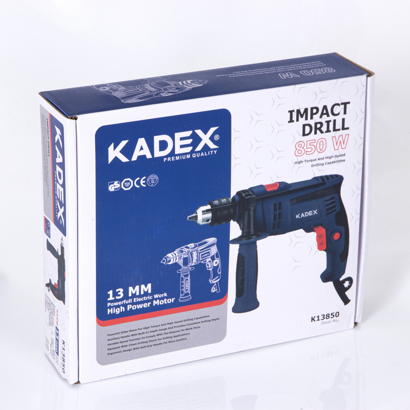 دریل برقی کادکس مدل K13850 دارای موتور 850وات واقعی عمدتا جهت کاربری صنعتی و خانگی جهت سوراخکاری چوب ، آهن و بتن استفاده میشود. به دلیل وجود حالت چکشی، به راحتی میتوان سوراخکاری بر روی مصالح ساختمانی از قبیل دیوار ها را انجام داد. جهت راحتی کار، دسته گردان 360درجه نیز بر بروی این دریل وجود دارد. مصرفی ترین قطعه موجود در دریل، عمدتا ذغال آن است که یک جفت ذغال اضافه نیز به همراه این دریل ارائه میشود.