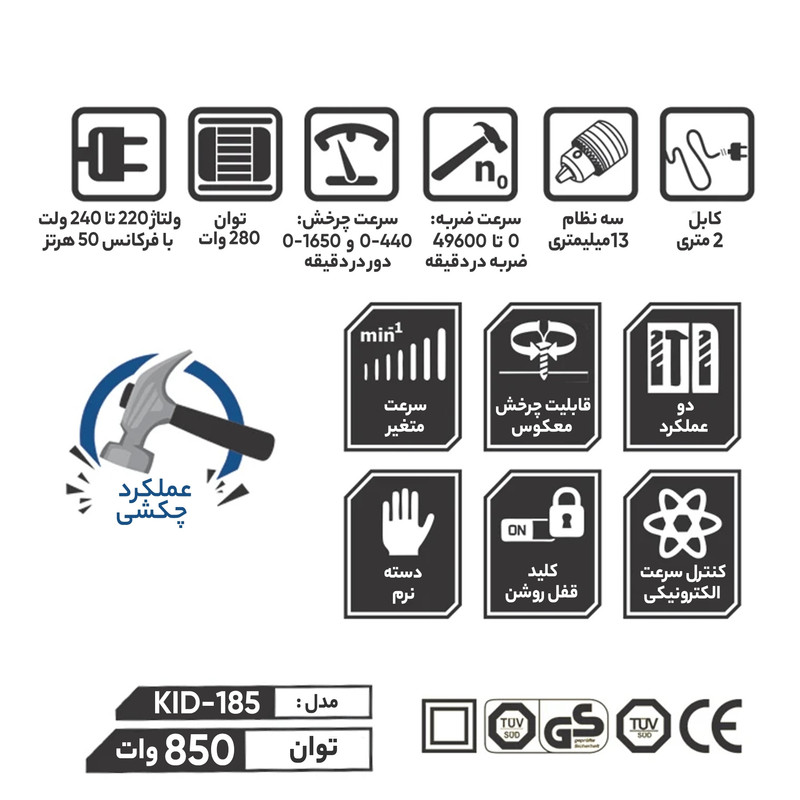 محصول فوق یکی دیگر ازمحصولات برقی تولیدی شرکت «کنزاکس» (Kenzax) میباشد. امروزه برای سوراخ کردن اجسام مختلف، از انواع دریلهای برقی یا شارژی استفاده میکنند. کار با این دستگاه کار چندان مشکلی نیست و نیاز به کسب مهارت خاصی ندارد. با توجه به میل افراد جامعه به انجام کارهای فنی در منزل، در بسیاری از خانهها نمونهای از این دستگاه دیده میشود. دریلها انواع مختلفی دارند و انرژی موردنیاز خود را از برق یا باتری میگیرند. با استفاده از دریلهای معمولی قادر به سوراخ کردن اجسامی از جنس چوب، پلاستیک یا فلزات می باشید. اما با این دریل که قابلیت سوراخ کاری در حالت چکشی را داراست علاوه بر این موارد، دیوار، سرامیک و انواع مصالح ساختمانی را میتوانید سوراخ کنید. دریل چکشی کنزاکس ابزاری مناسب برای سوراخکاری در انواع سطوح چوبی و فلزی و مصالح ساختمانی می باشد. این دریل چکشی حدود 2100 گرم وزن دارد و در ابعاد کوچک 28 × 20 × 7 سانتیمترتولید شده است . با توجه با استفاده از سه نظام فلزی مارک پیکاک حداکثر قطر سوراخکاری آن در دیوار 13 میلیمتر, چوب 25 میلیمترو در فلز 10 میلیمتراست. این دستگاه از سیستم گردشی راستگرد و چپ گرد بهره میبرد. و حالت سوراخ کاری معمولی و ضربهای را برای شما فراهم میسازد. منبع تغذیهی این دریل، برق شهری است و با ولتاژ ورودی 220 ولت کار میکند. توان خروجی این ابزار 850 وات است و میتواند با سرعت گردش صفر تا حداکثر 3100 دور در دقیقه به سوراخکاری بپردازد. برای سهولت در سوراخکاری، دستهای کمکی از جنس آلومینیوم با تزریق دو رنگ و روکش TPR ضد تعریق با قابلیت چرخش 360 درجه در قسمت جلویی دستگاه قرار دارد و از یک خط کش فلزی که عمق سوراخ کاری را تنظیم می کند بهره می برد. شرکت کنزاکس که همیشه در تولید ابزار های صنعتی نوآور است این محصول را تحت عنوان مدل «KID-185» به بازار عرضه میکند. لازم به ذکر است این دریل مخصوص کار روی فلزات ، انواع چوبها ، PVC ، مصالح بنایی از قبیل دیوار و بتن و موادی است که فشار معکوس به دریل وارد نمیکنند .