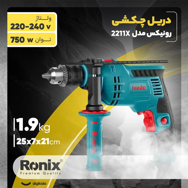 دریل چکشی 2211X رونیکس دارای یک موتور قدرتمند 750 واتی است که میتواند سرعتی بالغبر 2700 دور در دقیقه را ایجاد کند. این سرعت توسط کلید دیمردار کنترل سرعتی که در این ابزار تعبیه شده، قابل تنظیم است. همچنین با قابلیت چکشی در 2211X رونیکس، هیچ نگرانی در زمان سوراخکاری انواع مصالح نخواهید داشت. دامنه کاربری آن را بیشتر میکند. سهنظام 13 میلیمتری این دریل، تمامفلزی، مقاوم و از نوع آچاری است. طراحی ارگونومیک، کوچک، کمحجم و 1.73 کیلوگرمی (1.93 کیلوگرم با دسته )به منظور استفاده از ابزار در زمانی طولانیتر؛ ساختهشده از فیبر شیشهای تقویتشده (PA6+GF30)؛ خوشدست و قابل حمل؛ قابل استفاده در مکانهای مختلف؛ مجهز به دسته جانبی ارگونومیک با هدف کنترل بهتر دستگاه؛ دارای میله تنظیم عمق برای قابلیت سوراخکاری دقیقتر با عمق معین؛ دارای کابل 2 متری است.