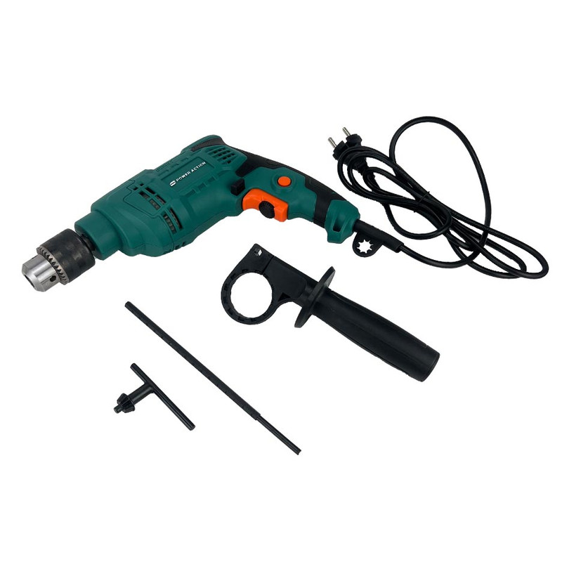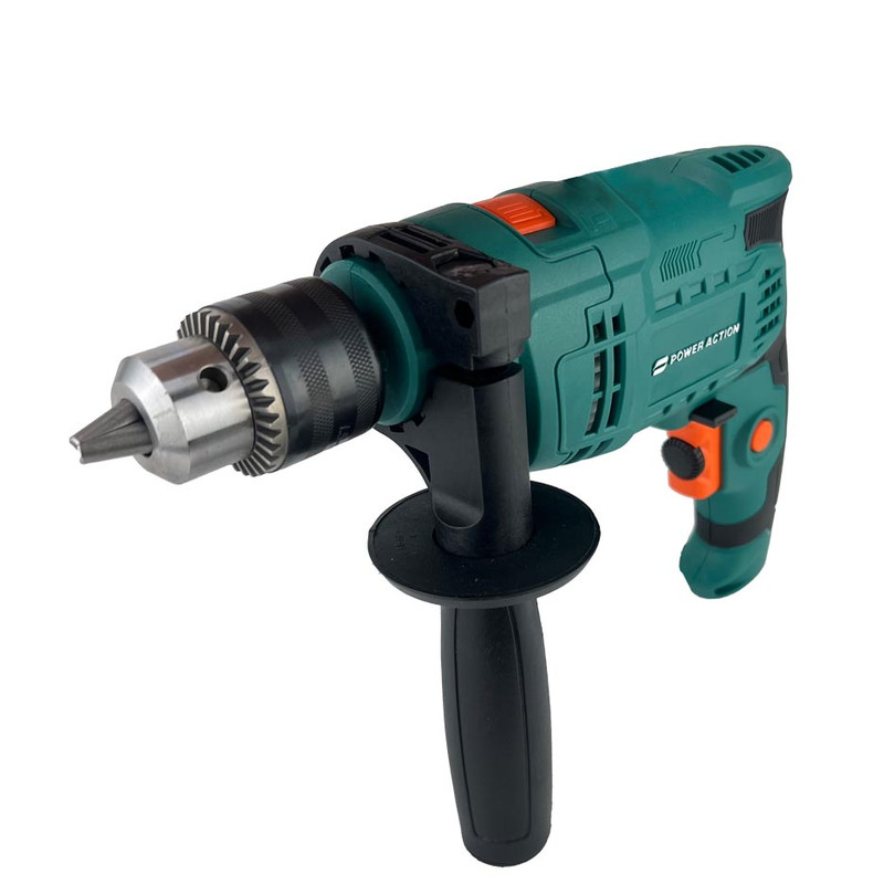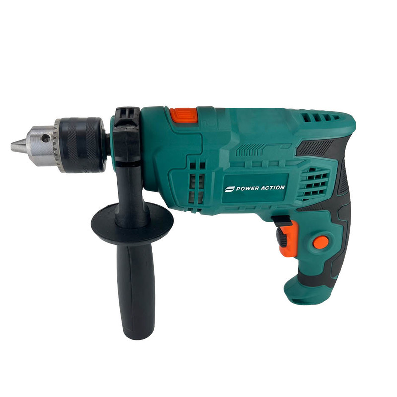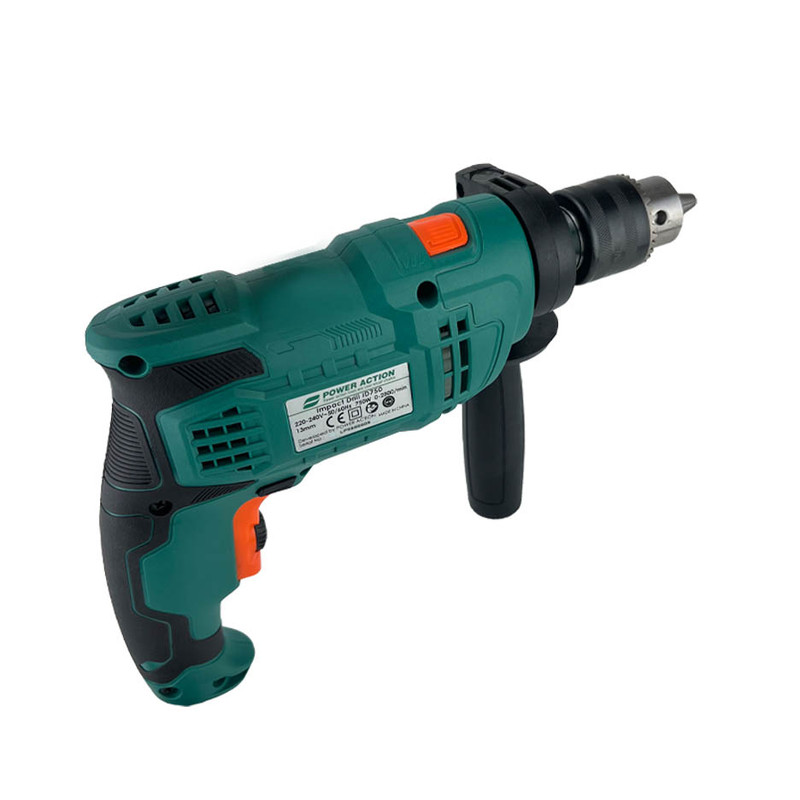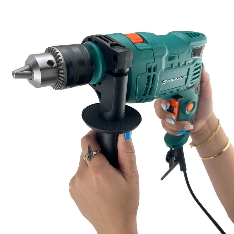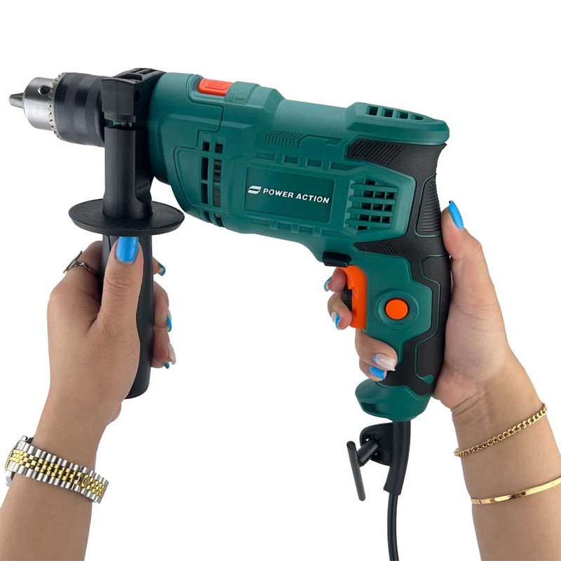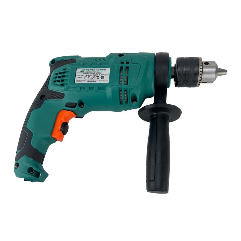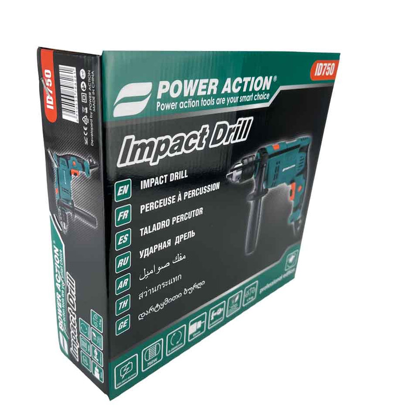 دریل چکشی پاوراکشن مدل ID750 دارای یک موتور قدرتمند 750 واتی است که میتواند سرعتی بالغبر 2800 دور در دقیقه را ایجاد کند. این سرعت توسط کلید دیمردار کنترل سرعتی که در این ابزار تعبیه شده، قابل تنظیم است. همچنین با قابلیت چکشی در دریل پاوراکشن ، هیچ نگرانی در زمان سوراخکاری انواع مصالح نخواهید داشت. دامنه کاربری آن را بیشتر میکند. سهنظام 13 میلیمتری این دریل تمام فلزی بوده، مقاوم و از نوع آچاری میباشد. بدون هیچ سختی کار به ایجاد حفره در سطوح فولادی، چوبی و بتنی به ترتیب در اعماق 10، 25 و 13 سانتی می باشد. از دیگر ویژگی های دریل چکشی پاور اکشن، می توان به بدنه ارگونومیک، دسته کمکی، سه نظام 13 میلیمتر آچار خور،کارایی در دو حالت چکشی، مته و این دریل مجهز به قفل سوییچ در حالت روشن دستگاه، میله تنظیم عمق و… اشاره کرد. این ابزار فوق قدرتمند صنعتی با دارا بودن بدنه ارگونومیک و دستهی ضد تعریق برای کنترل بهتر، وزن فوق سبک (تنها 1.9 کیلوگرم) برای قدرت بیشتر از دریل چکشی پاور اکشن یک محصول حرفهای میسازد که شما را از قدرت خود ناامید نخواهد ساخت.