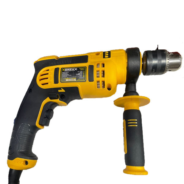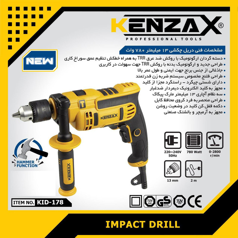 محصول فوق یکی دیگر ازمحصولات برقی تولیدی شرکت "کنزاکس" (KENZAX) میباشد. امروزه برای سوراخ کردن اجسام مختلف، از انواع دریلهای برقی یا شارژی استفاده میکنند. کار با این دستگاه کار چندان مشکلی نیست و نیاز به کسب مهارت خاصی ندارد. با توجه به میل افراد جامعه به انجام کارهای فنی در منزل، در بسیاری از خانهها نمونهای از این دستگاه دیده میشود. دریلها انواع مختلفی دارند و انرژی موردنیاز خود را از برق یا باتری میگیرند. با استفاده از دریلهای معمولی قادر به سوراخ کردن اجسامی از جنس چوب، پلاستیک یا فلزات هستید. اما با این دریل که قابلیت سوراخ کاری در حالت چکشی را داراست علاوه بر این موارد، دیوار، سرامیک و انواع مصالح ساختمانی را میتوانید سوراخ کنید. دریل چکشی کنزاکس ابزاری مناسب برای سوراخکاری در انواع سطوح چوبی و فلزی و مصالح ساختمانی می باشد. این دریل چکشی حدود 2 کیلوگرم وزن دارد و در ابعاد کوچک 28 × 20 × 7 سانتیمترتولید شده است. با توجه با استفاده از سه نظام فلزی مارک پیکاک حداکثر قطر سوراخکاری آن در دیوار 13 میلیمتر, چوب 25 میلیمترو در فلز 10 میلیمترمی باشد. این دستگاه از سیستم گردشی راستگرد و چپ گرد بهره میبرد. و حالت سوراخ کاری معمولی و ضربهای را فراهم میسازد. منبع تغذیهی این دریل، برق شهری است و با ولتاژ ورودی 220 ولت کار میکند. توان خروجی این ابزار 780 وات است و میتواند با سرعت گردش حداکثر 2800 دور در دقیقه به سوراخکاری بپردازد. برای سهولت در سوراخکاری، دستهای کمکی با روکش نرم در قسمت جلویی دستگاه قرار دارد و از یک خط کش که عمق سوراخ کاری را تنظیم می کند بهره می برد. شرکت کنزاکس که همیشه در تولید ابزار های صنعتی نوآور است این محصول را تحت عنوان مدل «KID-178» به بازار عرضه میکند. لازم به ذکر است این دریل مخصوص کار روی فلزات ، انواع چوبها ، PVC ، مصالح بنایی از قبیل دیوار و بتن و موادی است که فشار معکوس به دریل وارد نمیکنند .