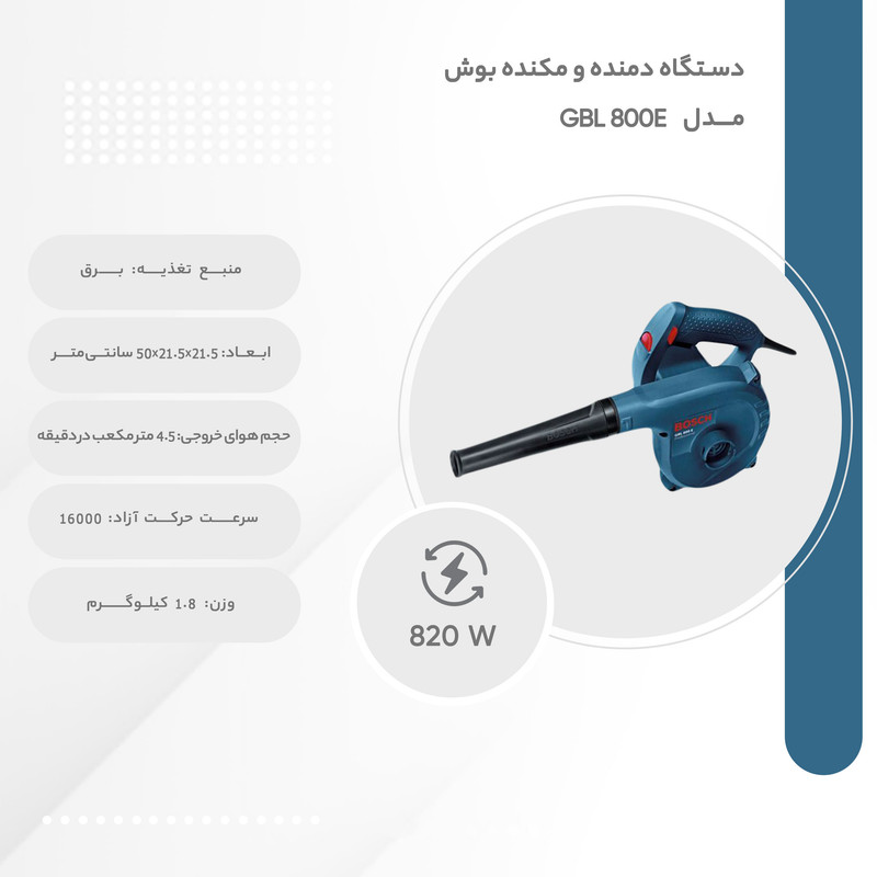 محصول فوق از لحاظ توان یکی از محصولات میانردهی بازار است. این محصول نوعی دستگاه دمنده و مکنده بوده که توانی برابر 820 وات دارد. با کمک این دستگاه میتوان باد را با فشاری بالا بهسمت سطح مورد نظر متمرکز کرد. معمولا از این قدرت باد برای تمیز کردن گردوغبار استفاده میشود. برای این کار نازلی پلاستیکی روی دستگاه قرار دارد. با تغییر محل نازل پلاستیکی روی دستگاه میتوان آن را به یک دستگاه مکنده تبدیل کرد. برای این منظور یک کیسهی جمعآوری زباله نیز در نظر گرفته شده است. سرعت چرخش موتور این دستگاه 16000 دور بر دقیقه بوده و قادر است در مدتزمان یک دقیقه 4.5 متر مکعب هوا را از نازل خود خارج سازد. از دیگر مزایای این محصول میتوان به قابلیت تنظیم سرعت باد خروجی آن اشاره کرد. این دستگاه دمنده و مکنده را شرکت معروف «بوش» (Bosch) تحت عنوان مدل « GBL 800E» به بازار عرضه میکند.