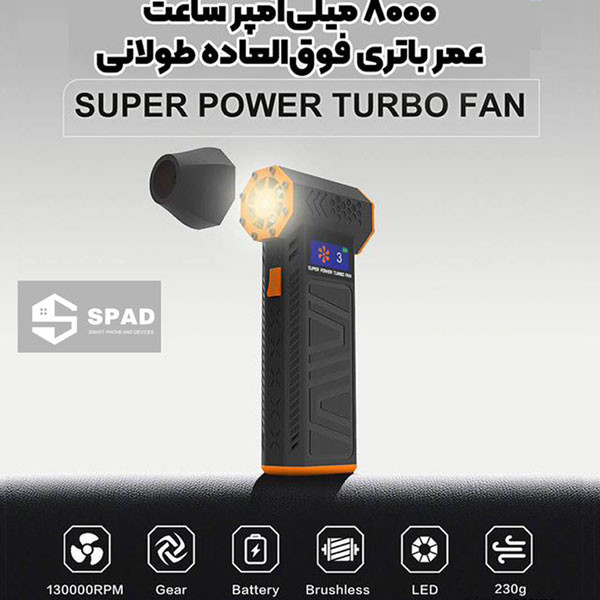 اگر بهدنبال یک فن دستی فوقالعاده قدرتمند، سبک و کاربردی هستید، جتفن Super Power Turbo Fan برند اسپاد بهترین انتخاب شماست. این محصول با طراحی مدرن و موتور براشلس (بدون جاروبک) ساخته شده تا طول عمر بالا، صدای کمتر و بازدهی بیشتری داشته باشد.باتری داخلی ۸۰۰۰ میلیآمپر ساعتی این فن، عمر شارژ طولانی را تضمین میکند و به شما این امکان را میدهد که بدون نگرانی از تمام شدن شارژ، ساعتها از آن استفاده کنید. همچنین نمایشگر دیجیتال میزان شارژ و حالت عملکرد، کنترل کامل دستگاه را در اختیار شما میگذارد.با سرعت چرخش ۱۳۰,000 RPM و فشار باد ۲۳۰ گرم، این جتفن میتواند در کوتاهترین زمان باد قدرتمندی تولید کند. چراغ LED تعبیهشده روی دستگاه نیز آن را به ابزاری کاربردی برای استفاده در شرایط کمنور یا محیطهای باز تبدیل کرده است.