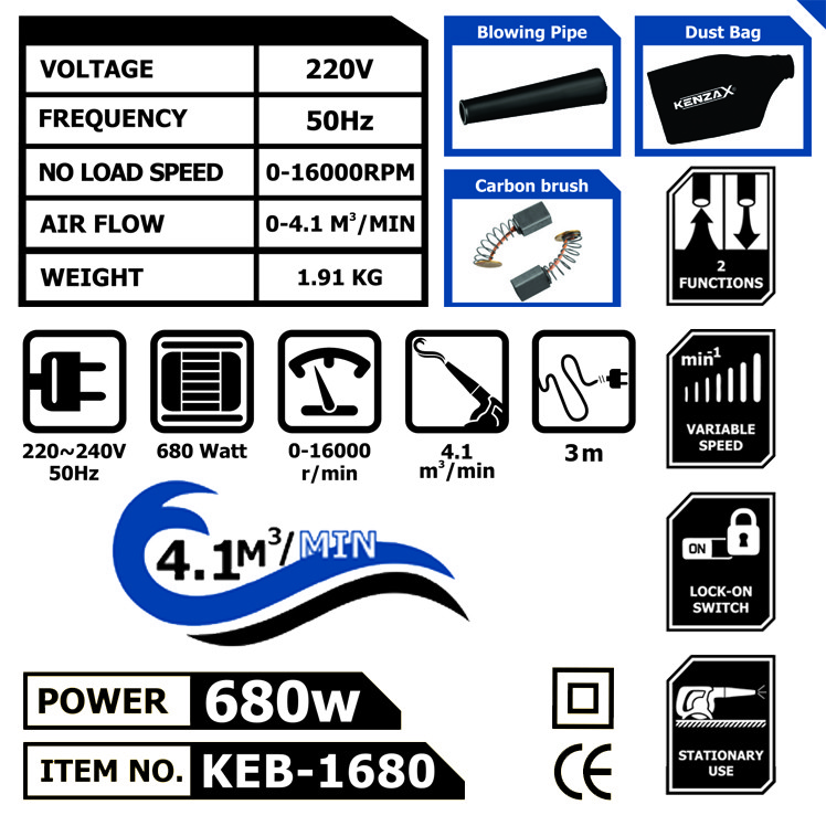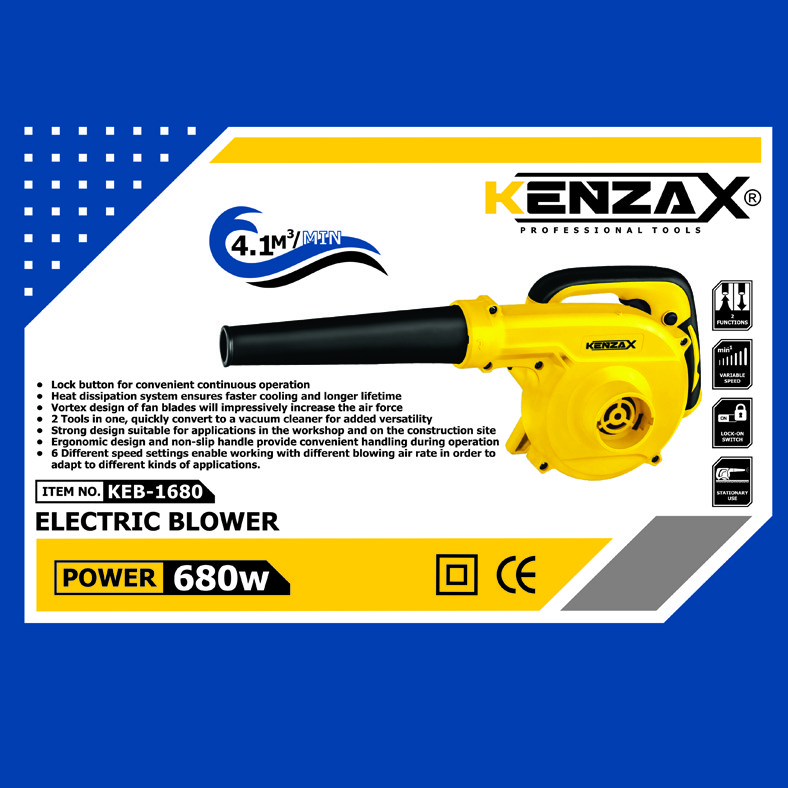 محصول فوق یکی دیگر ازمحصولات برقی تولیدی شرکت «کنزاکس» (Knzax) میباشد. بلوور برقی مدل KEB-1680 دارای موتور پرقدرت 680 وات است؛ که مجهز به فن پرقدرت و توربو با طراحی جدید و صدای یکنواخت حین کار می باشد. این محصول دارای قابلیت دمنده و مکنده به صورت همزمان می باشد. این دستگاه به کلید دیمر دار بمنظور تغییر سرعت روی بدنه همچنین به شصتی قفل کن حین کارکرد با دستگاه مجهز شده است و دارای لوله دمنده و مکنده لاستیکی و کابل رابرروکش ضخیم 3 متری می باشد. با توجه به قابلیت های در نظر گرفته شده موجب سهولت در در انجام کار مداوم می باشد . کلید دیمردار در نظر گرفته تا سرعت پرتاب باد را کم یا زیاد نماید. حداکثر پرتاب و خروجی باد تولید شده این دستگاه تا 4.1 متر مکعب در دقیقه میرسد . لوله خرطومی انعطاف پذیر و کیسه جمع کننده گرد و خاک با قابلیت تخلیه سریع از مشخصه های این دستگاه است. طراحی آرگونومیک دسته باعث جلوگیری از خستگی و تعریق میشود. به همراه این دستگاه 2 عدد ذغال یدک ارایه گشته است که با توجه به طراحی خاص کنزاکس تعویض زغال ها بی نیاز از بازکردن پوسته دستگاه خواهد بود . طراحی منحصر به فرد پایه جهت حفظ تعادل ابزار روی سطح کار