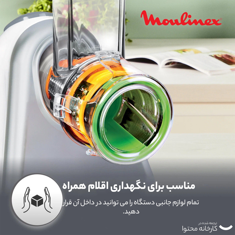 رنده برقی مولینکس مدل DJ756 از دیگر محصولات شرکت مولینکس (Moulinex) است که از طراحی زیبا و کارایی بالایی برخوردار است. کاربری این دستگاه فوقالعاده ساده بوده و کافی است با توجه به مواد غذایی موردنظر تیغه یا رنده مربوطه را در دستگاه قرار دهید. به همراه این دستگاه کوچک رنده و برشزنهای متعددی عرضه شده که مصرفکنندگان را در تهیه سالاد و آمادهسازی وعده غذاهای گیاهی و سالم یاری میکند. فعالیت رنده برقی مولینکس مدل DJ756 بهراحتی از طریق دکمه روی دستگاه آغاز می شود. استفاده از مولینکس مدل DJ756 نهتنها ساده است، بلکه طراحی لوله ورودی و خروجی میوه و سبزیجات ایمنی لازم را نیز تأمین نموده و کاربر بدون نگرانی در کوتاهترین زمان میتواند آنها را خرد، رنده، و یا لایهلایه کند. این دستگاه نهتنها با رندههای ریزودرشت میتواند شما را در تهیه سالاد یاری کند، بلکه مواد غذایی متفاوتی نظیر پنیر را نیز میتوان با آن رنده کرد. علاوه بر این صفحه برشزن یا اسلایسر هم میتواند کاربردهایی نظیر لایهلایه کردن سیبزمینی داشته و لذت تهیه میان وعده هایی دیگر چون چیپس را برای شما به همراه داشته باشد. این دستگاه در ابعاد کوچکی طراحیشده و کابل آن نیز در قسمت پشتی دستگاه بهراحتی جمع میشود. رندهها همیشه جزو ابزارهای پرکاربرد در تهیه انواع غذا و سالادهای گوناگون به شمار میآیند و طی سالهای اخیر همانند دیگر لوازم آشپزخانه، نمونه برقی این ابزار کاربردی آشپزی نیز به جمع لوازم برقی آشپزخانه پیوسته است. لازم به ذکر است سازنده این دستگاه شرکت مولینکس (Moulinex) یک شرکت بزرگ فرانسوی است که از سال 1937 میلادی آغاز به کار کرده است. این شرکت در زمینههای مختلفی ازجمله ساخت لوازم برقی خانگی، فعالیتهای گستردهای انجام میدهد.