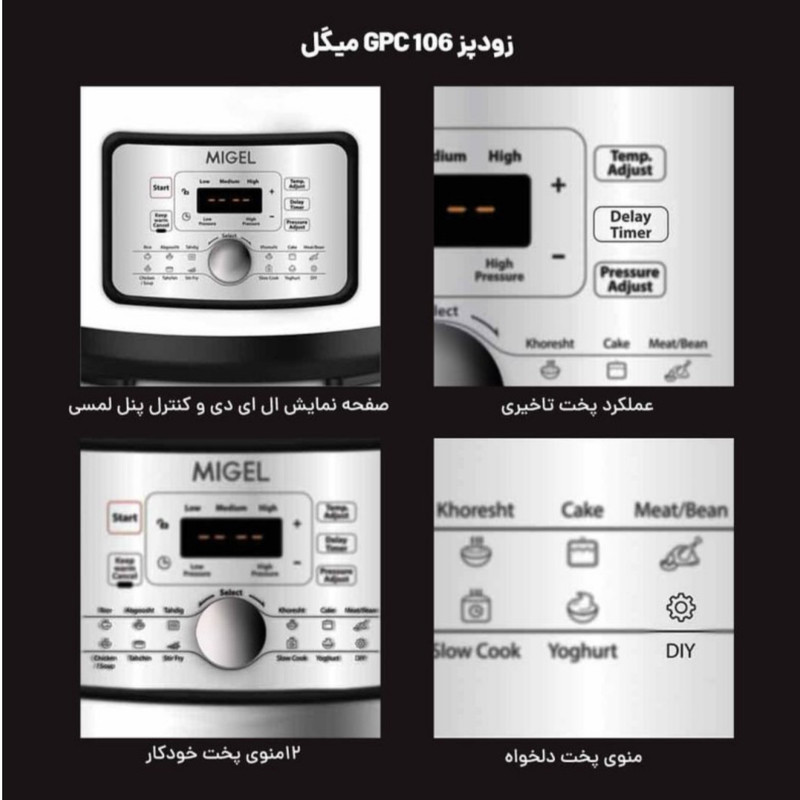 زودپز قدرتمند میگل با دیگ 6 لیتری همراه با پوشش نچسب و 12 منوی پخت خودکار یک وسیله بسیار کارآمد جهت پخت و پز می باشد. عملکرد منوی پخت دلخواه یکی از وجوه تمایز این کالا نسبت به سایر کالاهای مشاب در بازار است. همچنین وجود 6 عملکرد ایمنی و پخت تاخیری جهت زمان بندی دلخواه پخت از دیگر ویژگی های منحصربفرد این زودپز است.