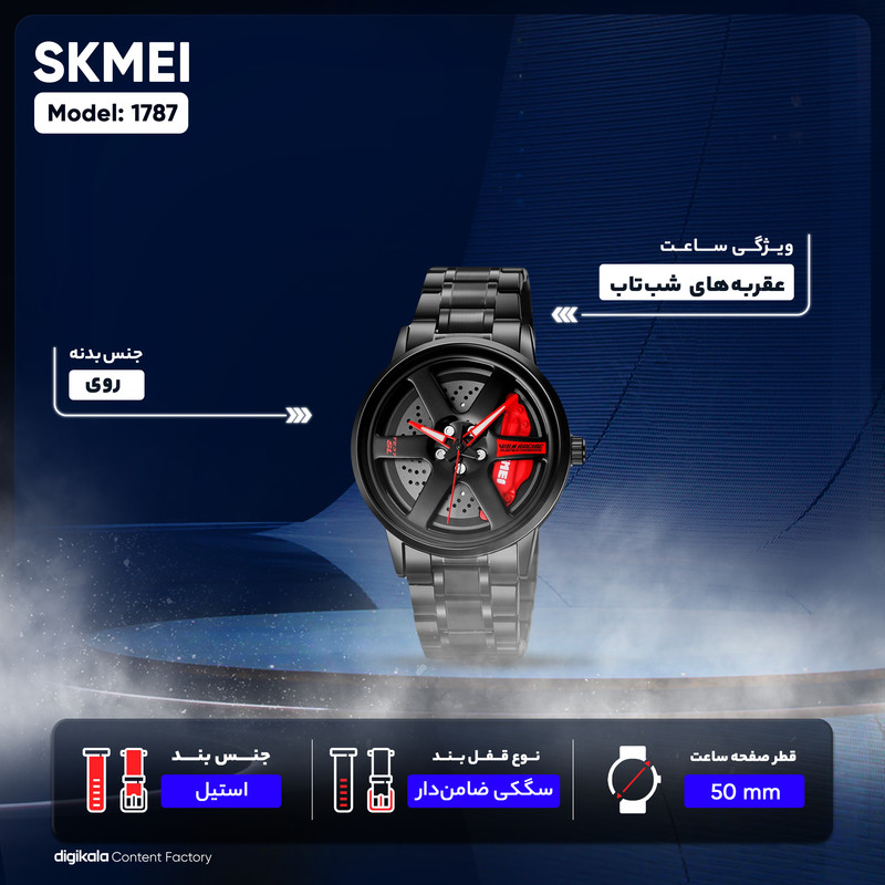 ساعتهای مچی از محبوبترین اکسسوریهای مردانه و زنانه هستند که در انواع عقربهای و دیجیتال در بازار موجودند. این ساعتها معمولاً دارای تقویم روزشمار هستند و در دو نوع مکانیکی و کوارتز عرضه میشوند. ساعت مچی عقربهای مردانه اسکمی مدل 1787 با موتور قدرتمند کوارتز خود، یکی از این محصولات است. رینگ داخل صفحه این ساعت متحرک بوده و با حرکت دست میچرخد. نیروی مورد نیاز این ساعت از طریق یک باتری تأمین میشود.
