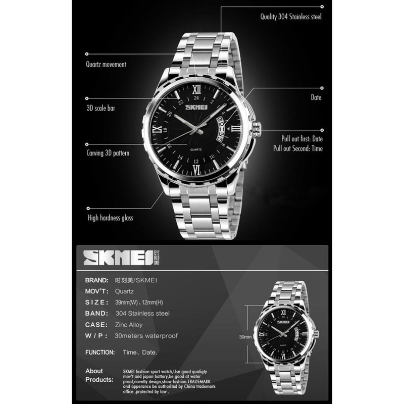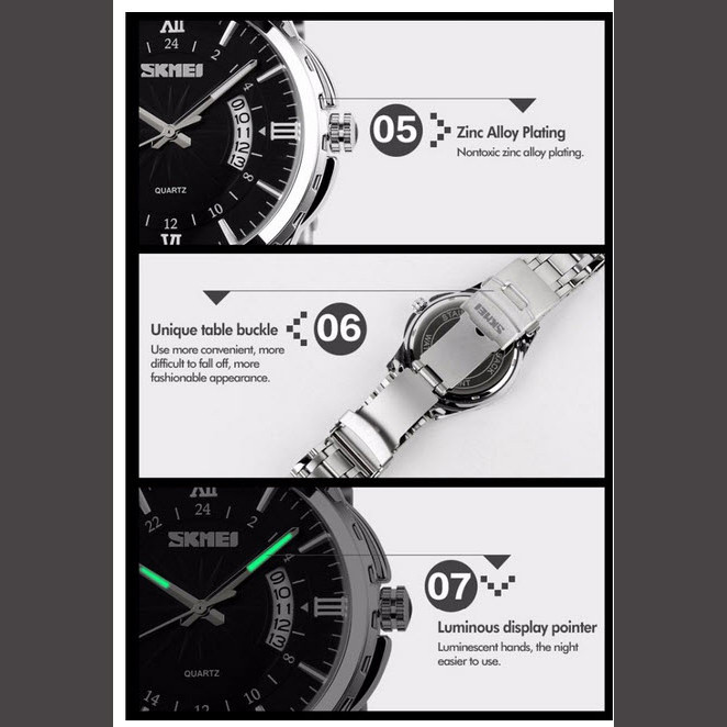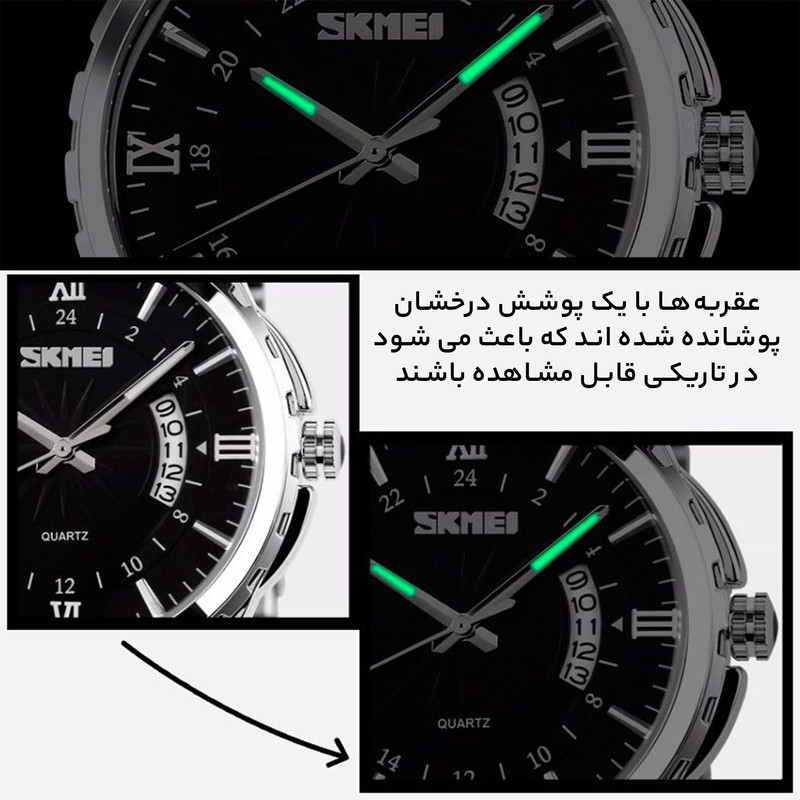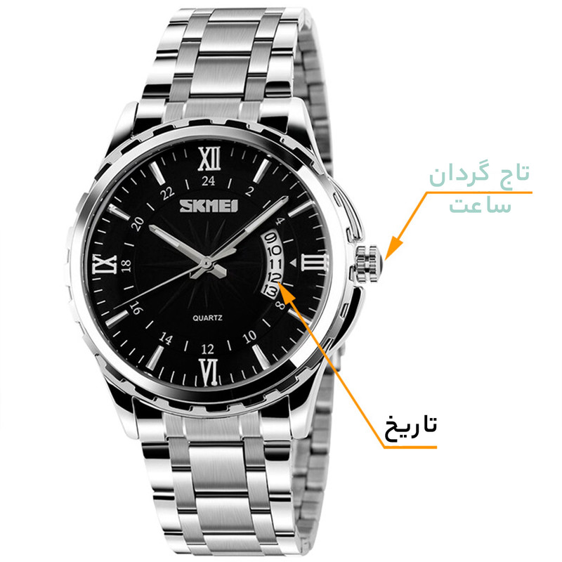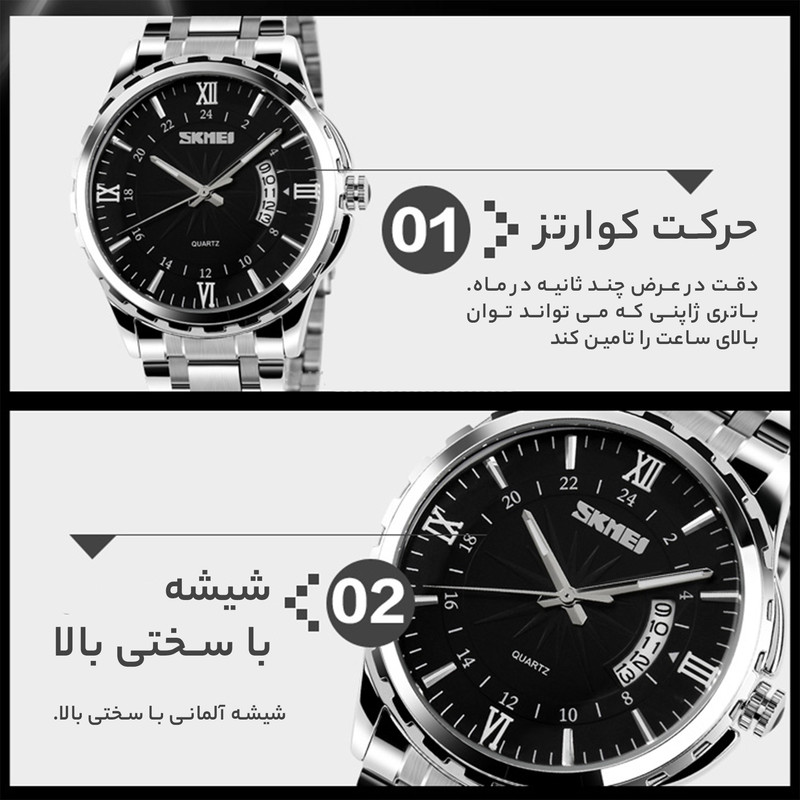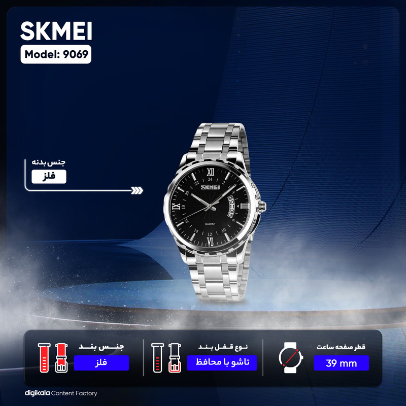 بند فلزی این ساعت به رنگ نقرهای با قفل تاشو و محافظ، امنیت و راحتی را در هنگام استفاده فراهم میکند. منبع انرژی این ساعت از نوع باتری است که طول عمر بالایی دارد. ساعت مچی اسکمی مدل 9069، مناسب برای مراسمهای رسمی و همچنین استفاده روزمره است و به راحتی میتواند با انواع استایلها هماهنگ شود. این ساعت از جمله تولیدات باکیفیت چین است که به واسطه طراحی زیبا و اصالتش، میتواند انتخابی هوشمندانه برای هر فردی باشد.