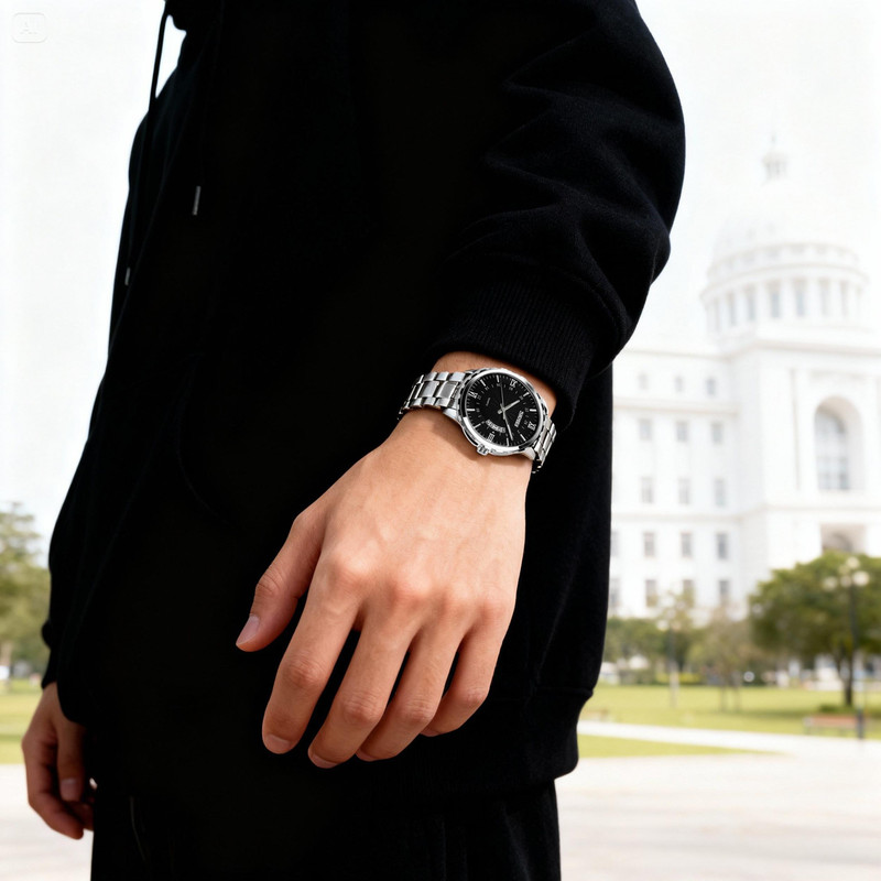 بدنه فلزی نقرهای رنگ این ساعت، استحکام و دوام بالایی را تضمین میکند. شیشه معدنی آن نیز از خشپذیری کمتری برخوردار است و به راحتی میتواند در برابر روزمرگیهای زندگی مقاومت کند. قطر صفحه ساعت 39 میلیمتر است که اندازهای متعادل برای مچ دست مردان به شمار میآید.