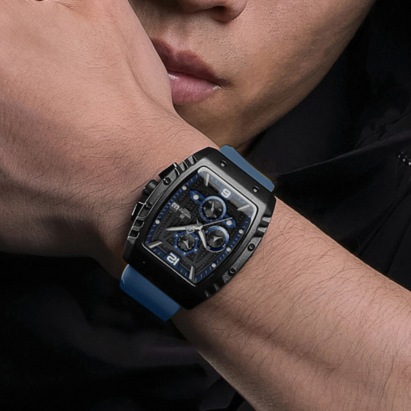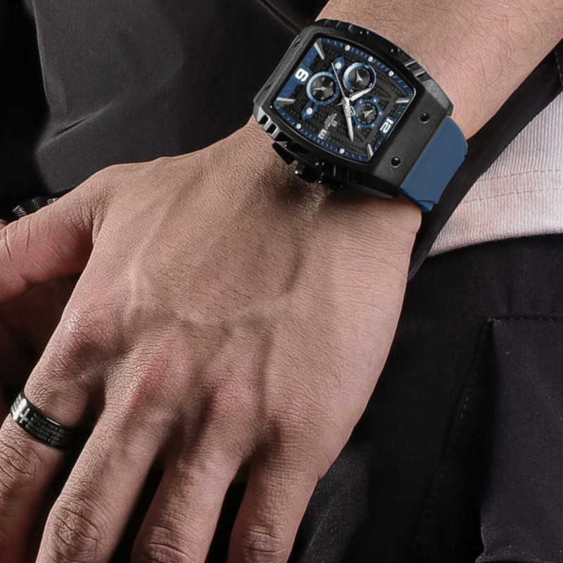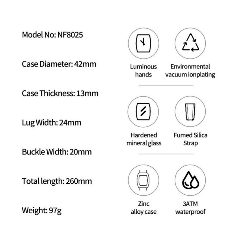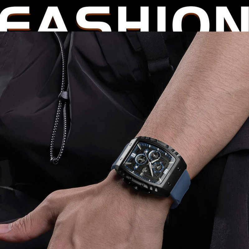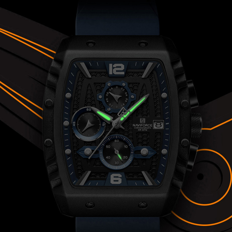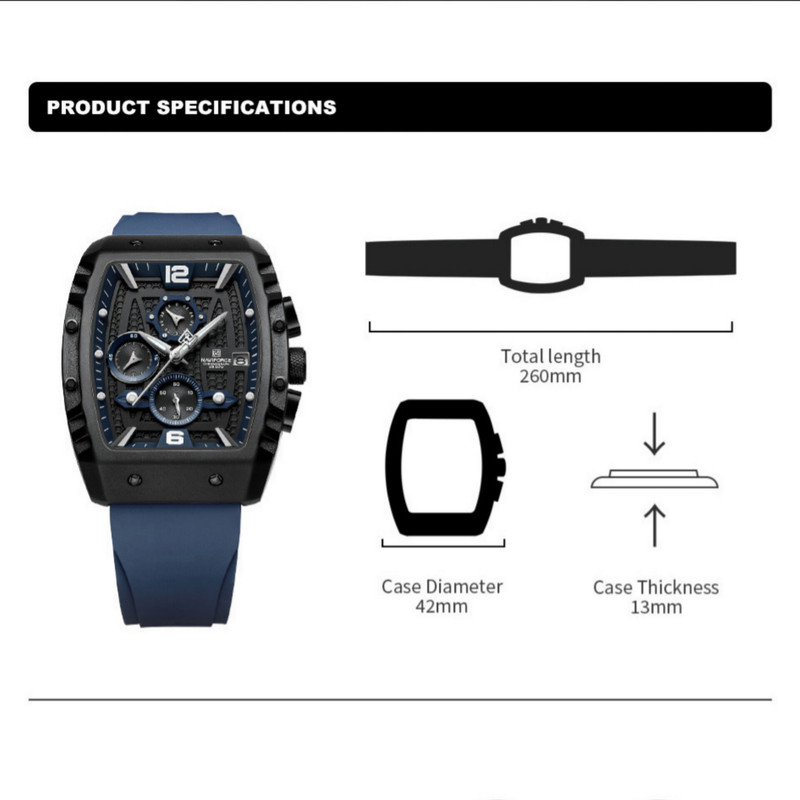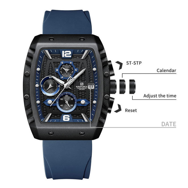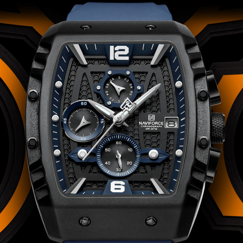 از پرطرفدارترین اکسسوریهای مردانه و زنانه، ساعتهای مچی هستند که در انواع مختلف عقربهای و دیجیتال در بازار عرضه میشوند. معمولا ساعتهای مچی دارای تقویم روزشمار نیز هستند که در دو نوع مکانیکی و کوارتز وجود دارند. ساعت مچی عقربه ای مردانه نیوی فورس مدل NF8025-B/BE جدیدترین مدل از این برند مشهور و معتبر میباشد که دارای موتور قدرتمند کوارتز کرنوگراف و تقویم روزشمار است و همچنین صفحه ساعت نقشدار برجسته کربنی است.این نوع محصول نیروی مورد نیاز خود را از طریق یک باتری تامین میکند. این مدل ساعتها در اندازهگیری زمان بسیار دقیق و قابل اعتماد بوده و درصد خطای آنها کمتر از انواع دیگر است.این ساعت دارای جنس بدنه آلیاژ روی ZINC ضد حساسیت و ضخیم به رنگ مشکی مات با بند مدل سیلیکونی آبی ضخیم با خط برجسته است.جنس درب پشت ساعت استیل ضدزنگ و ضخیم بوده و شیشه ساعت معدنی تقویت شده و مقاوم در برابر خراش است. عقربه های این ساعت شب تاب هستند و ساعت در برابر پاشش آب مقاوم است و ضمنا ساعت را نمیتوان در حمام گرم استفاده کرد. این ساعت عقربهای مردانه دارای ظاهری شیک و جذاب بوده و برای استفاده در شرایط رسمی و نیمهرسمی کاملا مناسب خواهد بود.