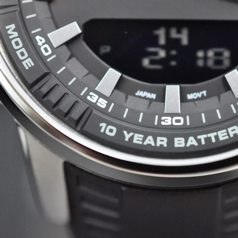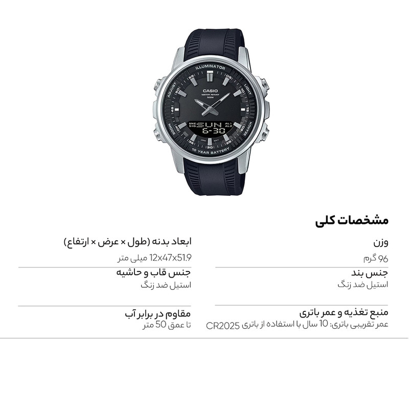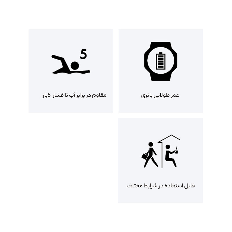 باتری CR2025 با عمر 10 ساله. دارای طراحی اسپرت و لوکس مقاوم در برابر آب تا 50 متر. جذب نور محیط و روشن ماندن صفحه برای مدتی کوتاه در تاریکی. دارای عقربه های شب تاب. قابلیت ذخیره سازی 30 نام (8 حرف) و شماره (16 رقم) و مرتب سازی حودکار. نمایش میزان حافظه باقیمانده. دارای نور LED پس زمینه به رنگ کهربایی. شمارش معکوس. نمایش زمان 30 شهر در 29 منطقه زمانی. زنگ هشدار ساعتی. کرونومتر با دقت 1/100 ثانیه. دقت ±30 ثانیه در ماه. تنظیم 3 هشدار روزانه. تقویم خودکار تا سال 2099. نمایش ساعت با فرمت 12/24 ساعته. تایمر باقابلیت تنظیم از 1 دقیقه تا 24 ساعت.