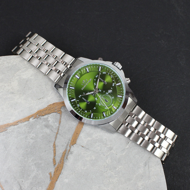 صفحه ی ساعت این برند دارای شیشه با سختی بالا می باشد، همچنین قلب تپنده ی آن یعنی موتور ساعت، از نوع کوارتز است. به دلیل اقتصادی بودن این ساعت فقط موتور اصلی و تقویم آن کار میکند و سه موتور بقیه نمایشی هستند . این ساعت به شکل دایره طراحی شده است که دارای قطر 42 میلی متر و بی نهایت ظریف است .