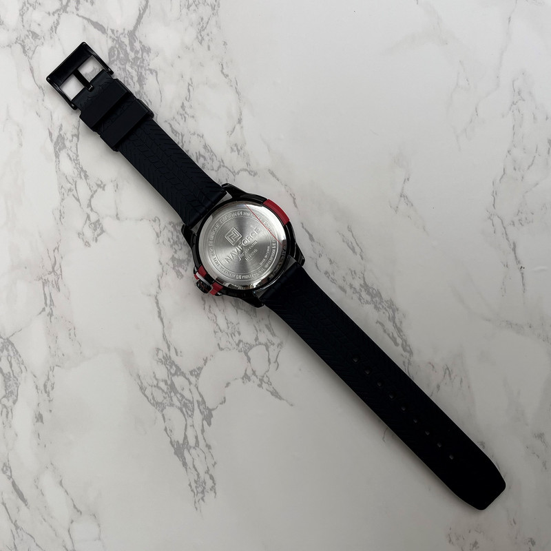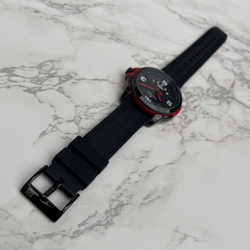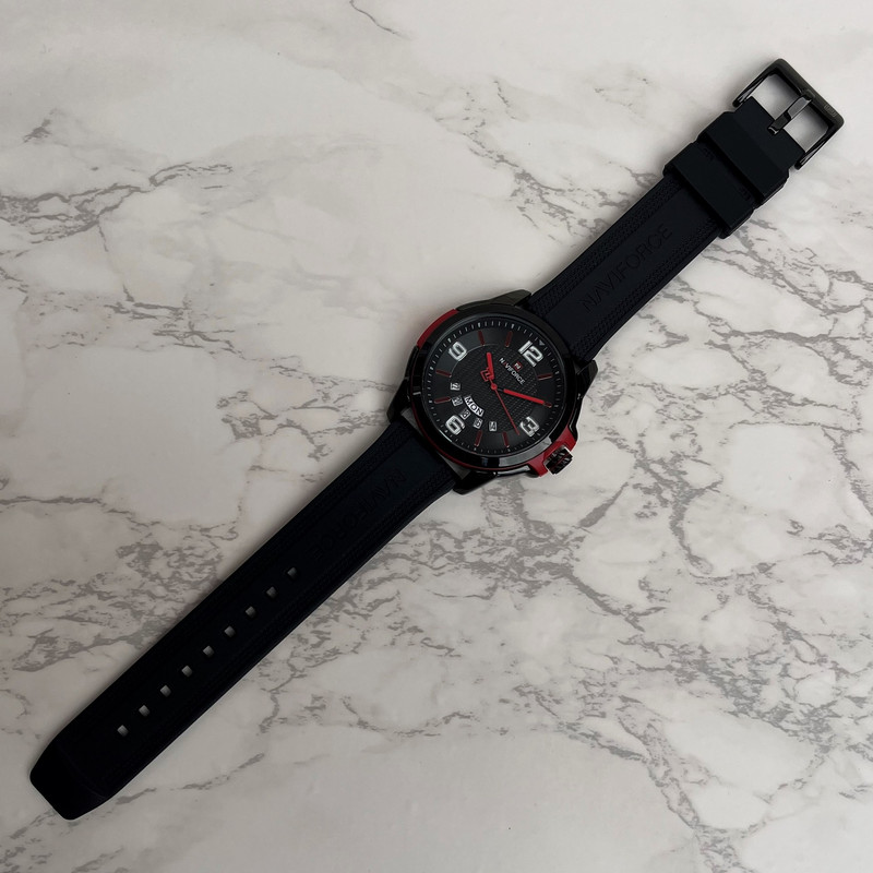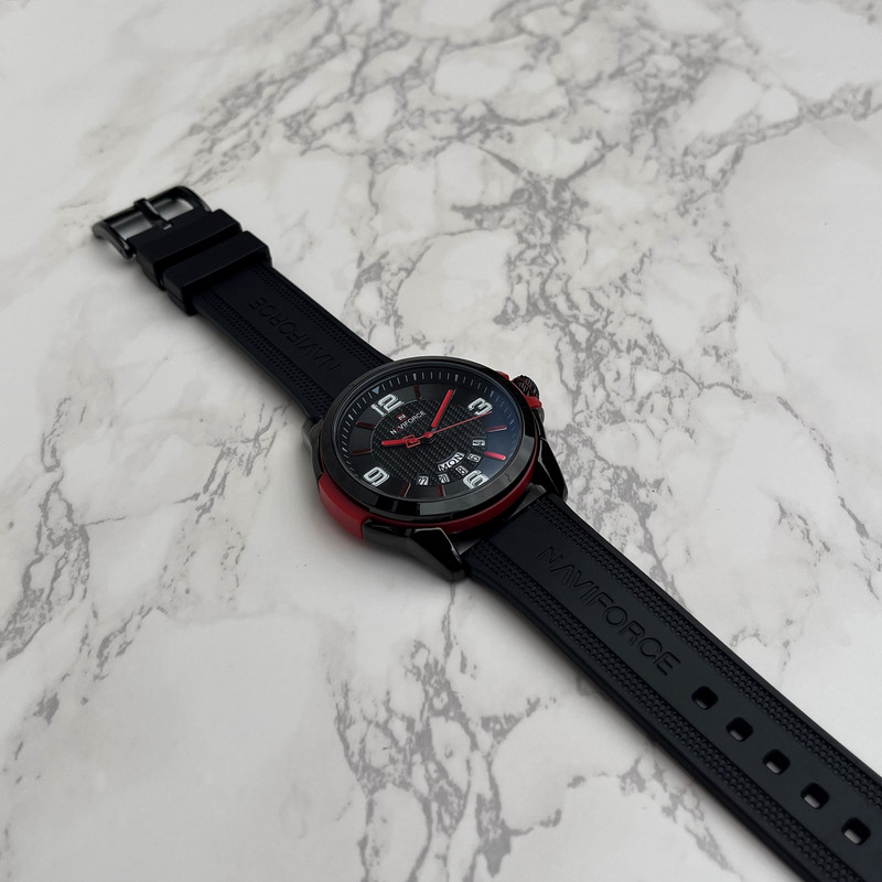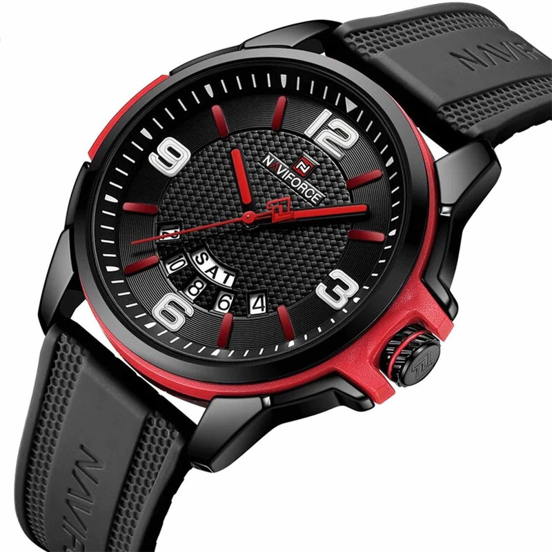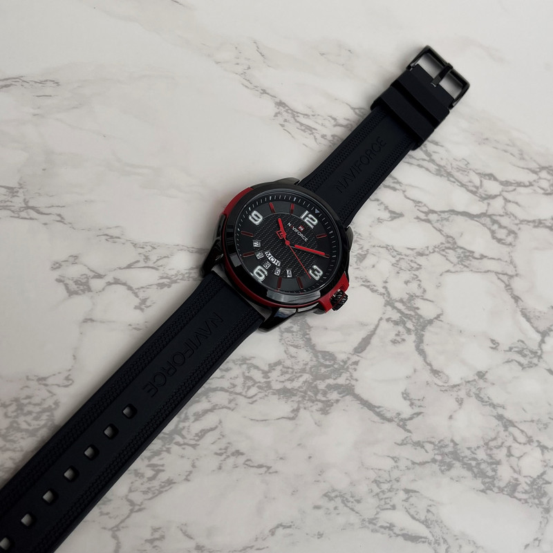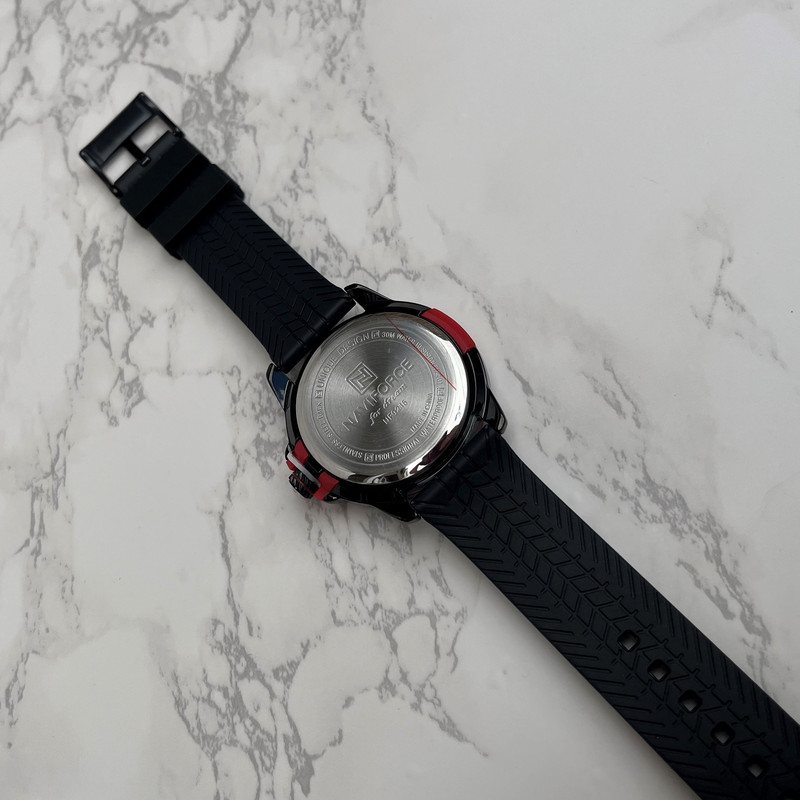 این مدل از ساعت مچی های مردانه اورجینال برند نیوی فورس بر اساس سبک اسپرت و روزمره بوده و دارای طراحی بسیار زیبایی می باشد. شیشه ی معدنی ضد خش و بند رابر بسیار باکیفیت و بدنه ی این ساعت استیل رنگ ثابت بوده که از ترکیب رنگ های مشکی و قرمز و سفید در آن استفاده شده است و جزو ساعت های خوش فروش برند نیوی فورس است و جزو بهترین و مناسب ترین ایده ها برای کادوی مردانه در مناسبت های مختلف میباشد. طراحی متفاوت این ساعت چشم هر بیننده ای را مینوازد. همچنین این ساعت دارای نمایشگر روزهای ماه و هفته و عقره های شب تاب نیز میباشد. و دارای 30متر مقاومت در برابر آب است. همچنین روی قفل و روی سرکوک ساعت و روی عقربه ی ثانیه شمار و صفحه ی ساعت و پشت درب برند نیوی فورس حک شده است.