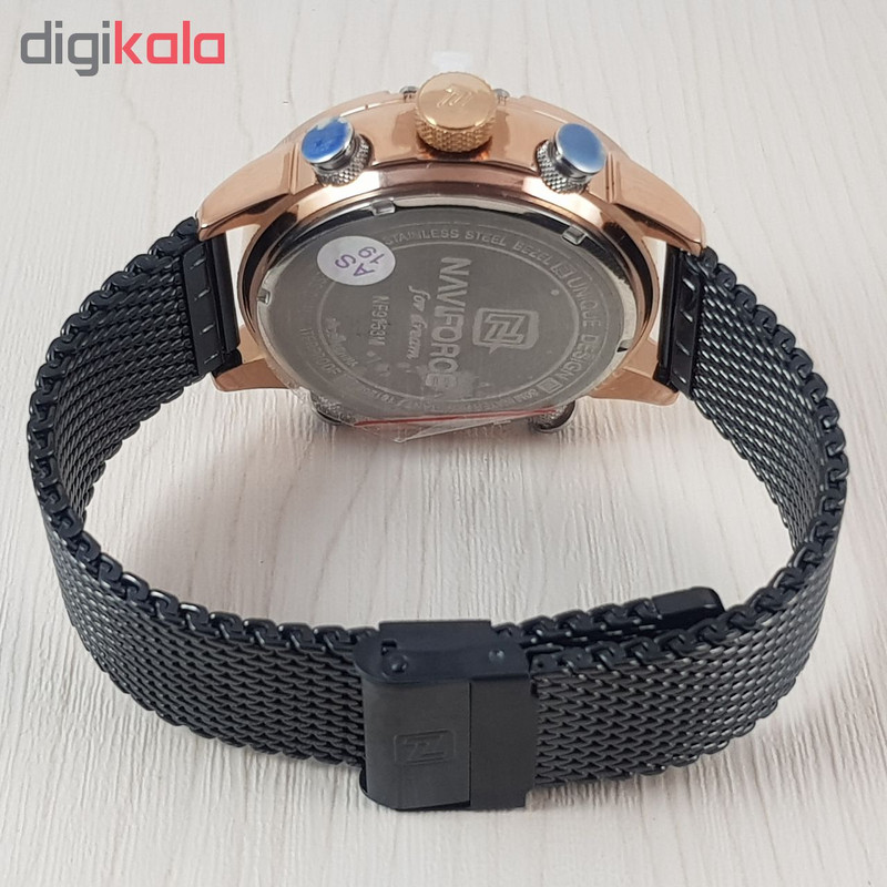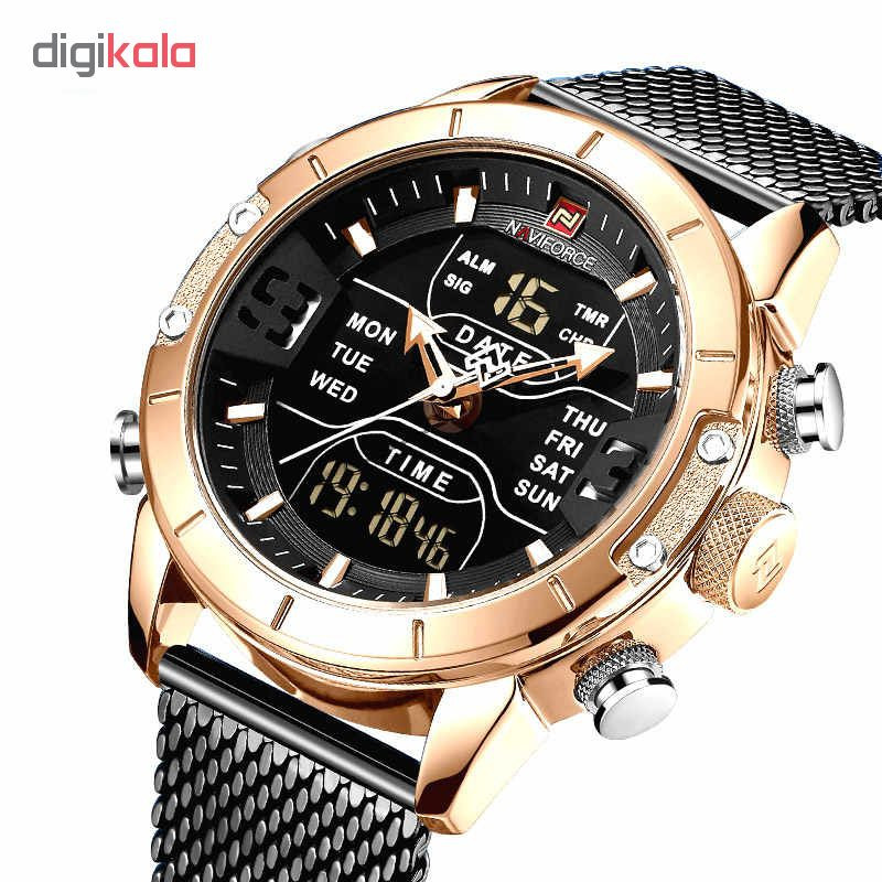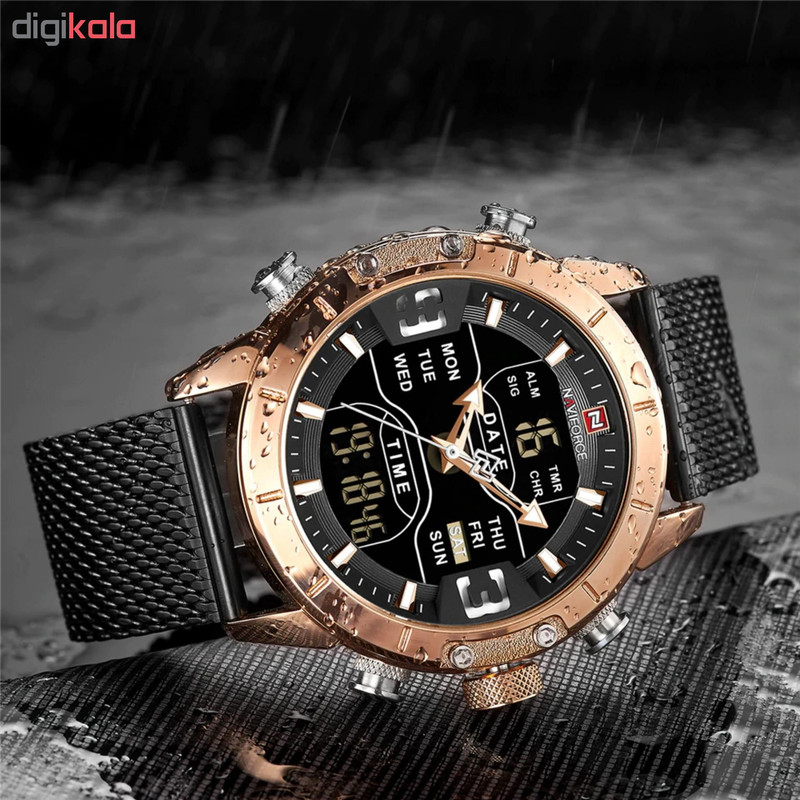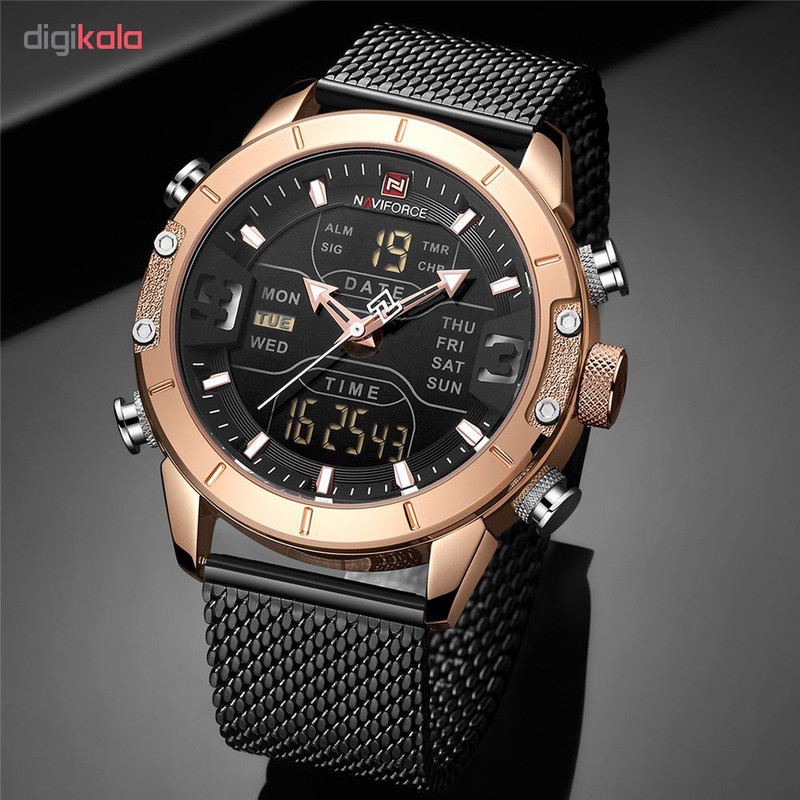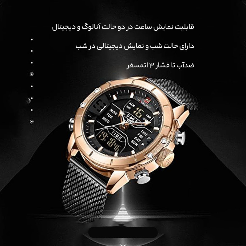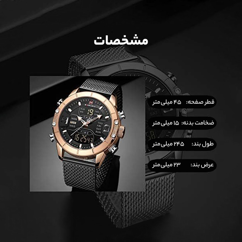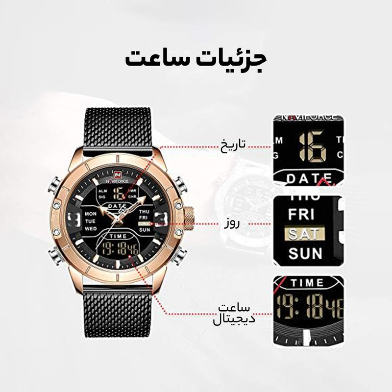 شرکت ساعتسازی نیوی فورس از برندهای مطرح در صنعت ساعتسازی است که ضمن تولید ساعتهایی با کیفیت ساخت و دقت بالا، همواره در طراحی این ساعتها نیز با تلاشی موفق خوش درخشیده و توانسته توجه سلیقههای مختلف را به خود جلب سازد. ساعت مچی عقربه ای مردانه نیوی فورس مدل NF9153-BL-RG یکی از مدلهایی است که در گروه سری ساعتهای دیجیتال آنالوگ قرار گرفته و با طراحی زیبای خود برای استفاده در موقعیتهای روزمره مناسب خواهد بود. این ساعت از شیشهی با آلیاژ معدنی و همچنین بدنهی فلزی و مستحکم بهره میبرد که نشان از کیفیت آن دارد. ترکیب رنگ مشکی و رزگلد در بدنه و بند و رنگ مشکی صفحه، جلوهی خاص و شکیلی به این مدل میبخشد. روزشمار دیجیتال هم با فونت سفید و پسزمینهی طلایی در میان صفحه از دیگر امکانات این مدل است که در کنار عقربههای اصلی به رنگ رزگلد و شبتاب سفید جلوه بسیار زیبایی به این مدل بخشیده است. روی صفحه علاوهبر روزشمار نمایش ساعت به صورت دیجیتال به چشم میخورد که به زیبایی این ساعت زیباافزوده است. این از یک باتری برای تأمین انرژی موردنیاز استفاده میکند. بند فلزی ساعت هم از ردیفهای مشکی تشکیل شده و ضمن برخورداری از یک قفل ضامندار کلیپسی از زیبایی و کیفیتی مطلوب بهرهمند است. این مدل با قطر صفحهی متوسط 45 میلیمتری در ردیف ساعت هایی با صفحه بزرگ قرار میگیردکه با طراحی زیبای بدنه و بند، روزشمار دیجیتال و کیفیت ساخت بالای بدنه و شیشه هدیهای ارزشمند و انتخابی قابلتأمل و ماندگار بهشمار میرود