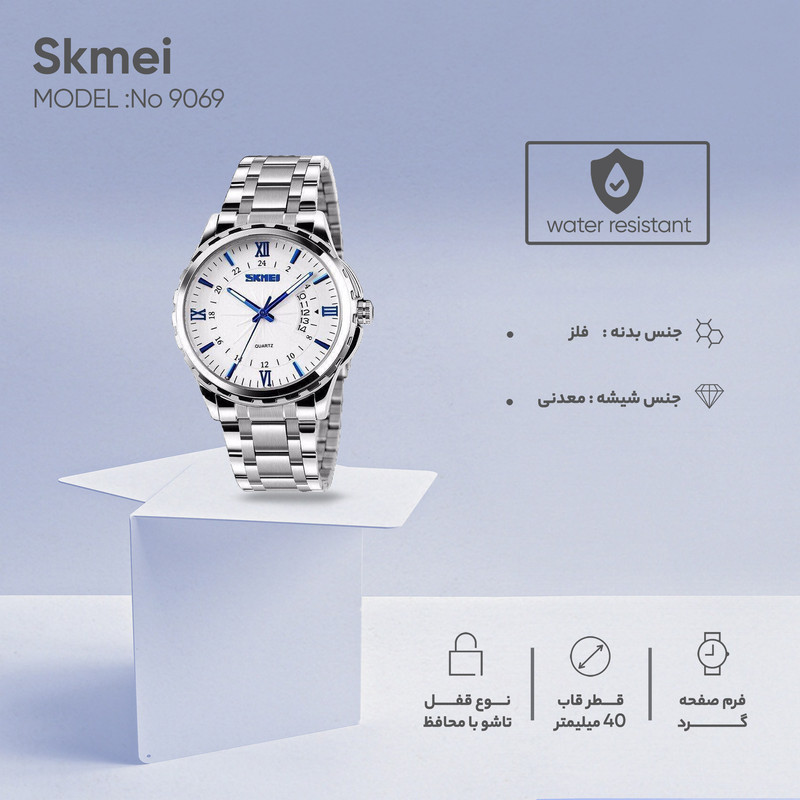 ساعت یکی از وسایل شخصی است که امروزه مورداستفاده همگان قرار میگیرد. این وسیله بسیار کارآمد است و بهجرئت میتوان گفت همه به آن نیاز دارند. اگر قصد خرید ساعت مچی دارید، ساعت مچی عقربهای اسکمی مدل No 9069 یکی از انتخابهایی که است که میتوانید آن را در نظر بگیرید. صفحه این ساعت فرمی گرد دارد و شامل تاریخ شمار میشود؛ همچنین دارای عقربههای شبتاب بوده که خواندن زمان را راحتتر میکند. بدنه این ساعت از جنس فلز روی بوده و بندهایش جنسی همانند بدنه دارد ؛ این محصول از ترکیب دورنگ سفید و نقرهای تشکیلشده که جلوه و زیبایی آن را چند برابر کرده است. میزان مقاومت آن در برابر آب 3ATM است و چون از فلز ضدزنگ ساختهشده بههیچعنوان در برابر آب آسیب نمیبیند. این ساعت بهوسیله یک قفل تاشو با محافظ بسته میشود و انتخاب خوبی برای آقایان و بانوان خوشسلیقه است.