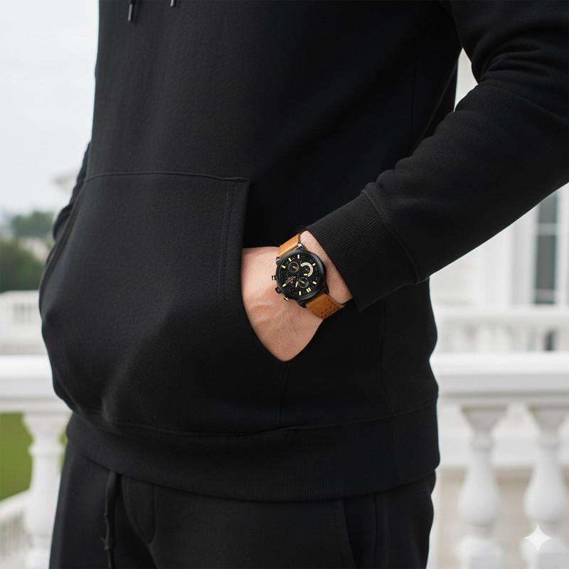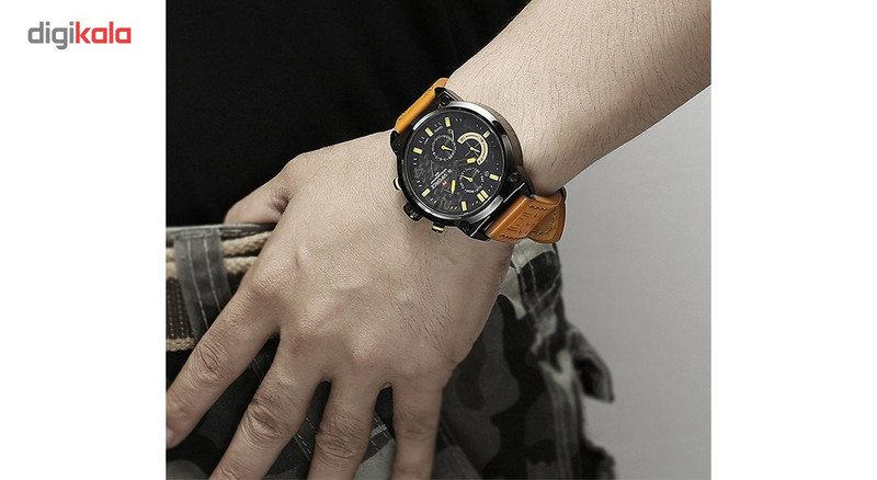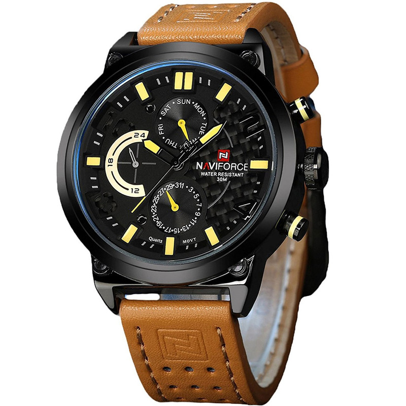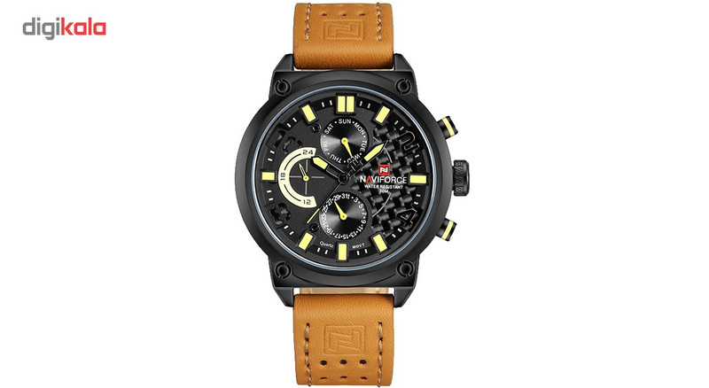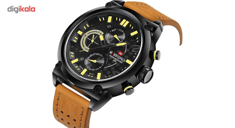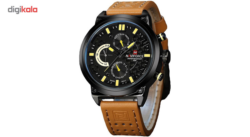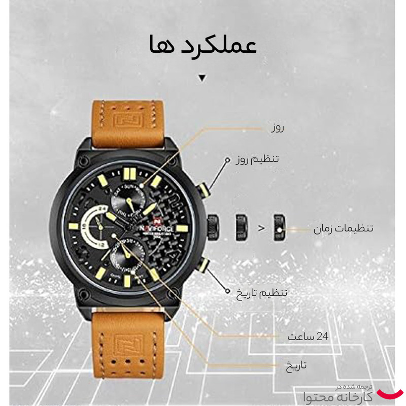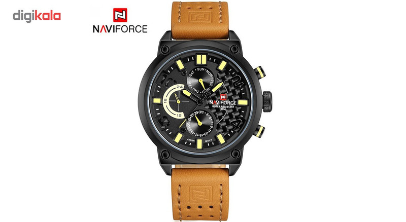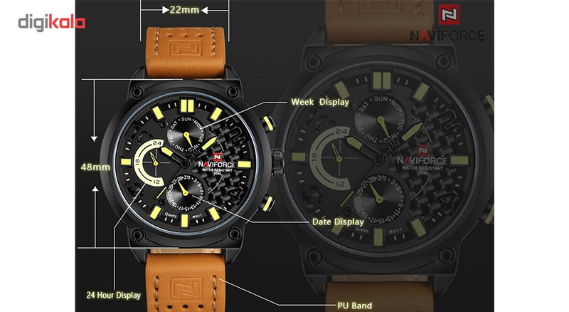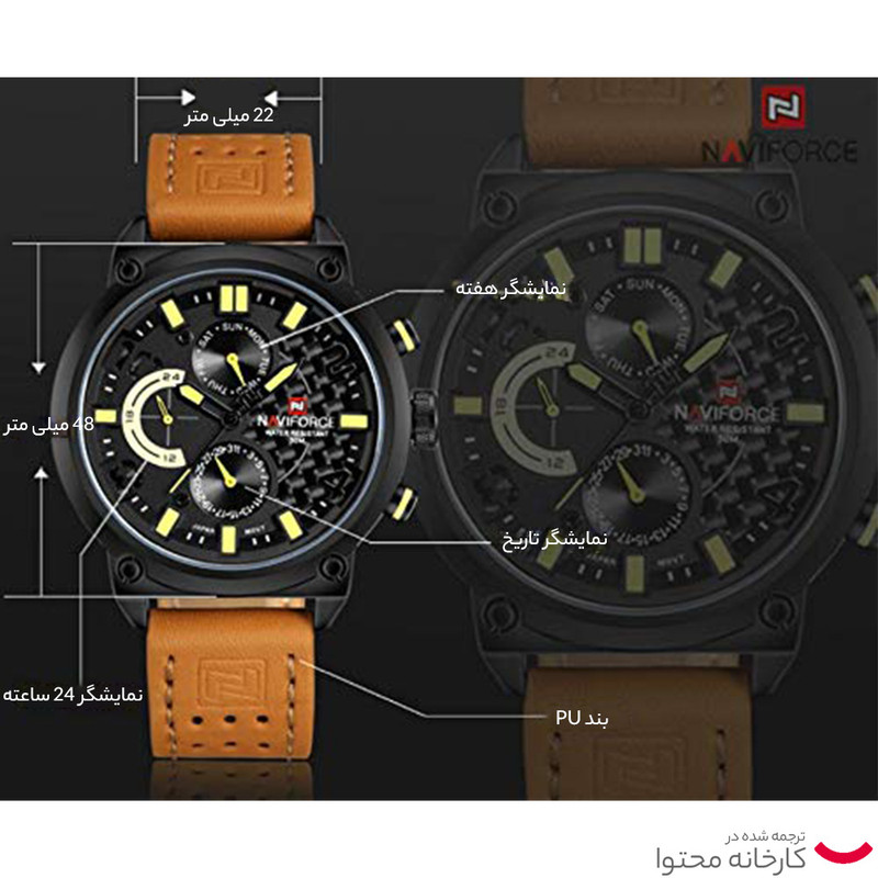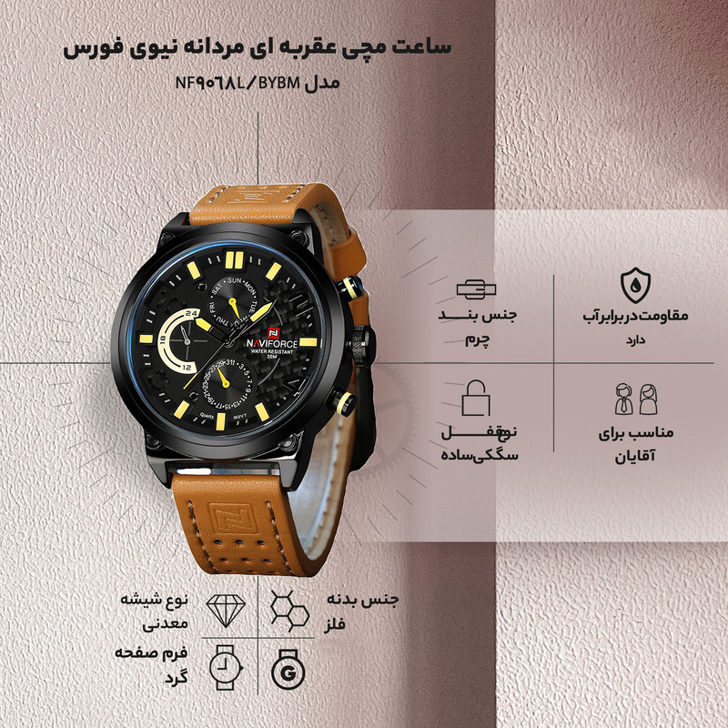 ظریف و همراه با استایل، این ساعت اسپریت مشکی رنگ به همراه رنگ زرد استفاده شده در عقربه ها و نشانگرهای آن، آن را به یک ضرورت برای آقایانای تبدیل نمده است که به مد و فشن اهمیت میدهند. جنس بند آن از نوع چرم و به رنگ قهوهای ساخته شده است که هنگامی که بر روی مچ خود میبندید هیچ گونه ناراحتی برای شما به همراه نخواهید داشت و بسیار لطیف میباشد. به لطف صفحه گرد و عقربه های موجود در آن ارزش این ساعت چندین برابر شده است و باعث میگردد تا هنگام استفاده از آن حس خاص بودن داشته باشید. استفاده از فلز ضد زنگ مشکی به همراه مقاومت در برابر آب نیز از مواردی است که این ساعت را ارزشمند تر از پیش برای شما میکند.کمپانی نیوی فورس، یکی از بزرگترین شرکتهای تولید ساعت آنالوگ است که بیشتر به خاطر کیفیت بسیار خوب، طراحی زیبا و در عین حال ارزش خرید بالا شهره است. مدل NF9068L/BYBM یک ساعت بند چرمی مردانه از نوع صفحه گرد است که دارای ویژگی نمایش تاریخ و نمایش ساعت به صورت 12/24 ساعته است که همین امر ارزش خرید این ساعت زیبا را دو چندان کرده است.
