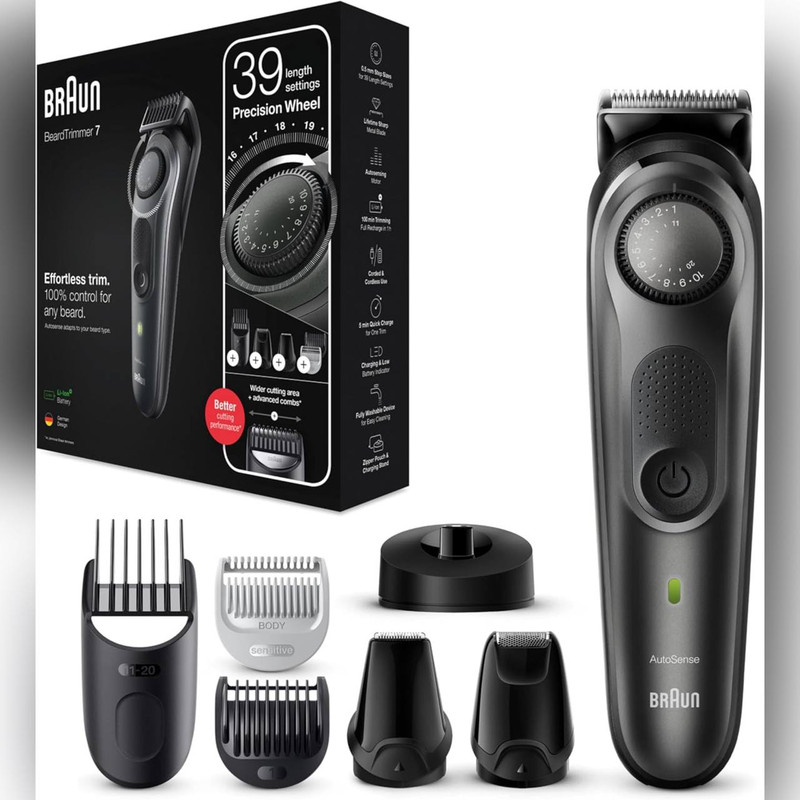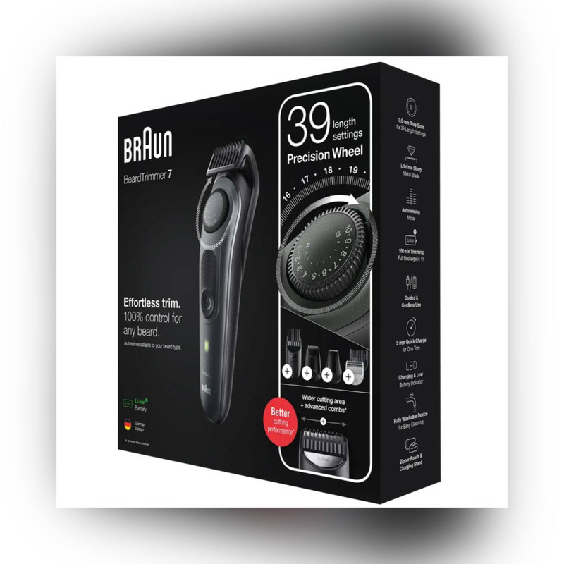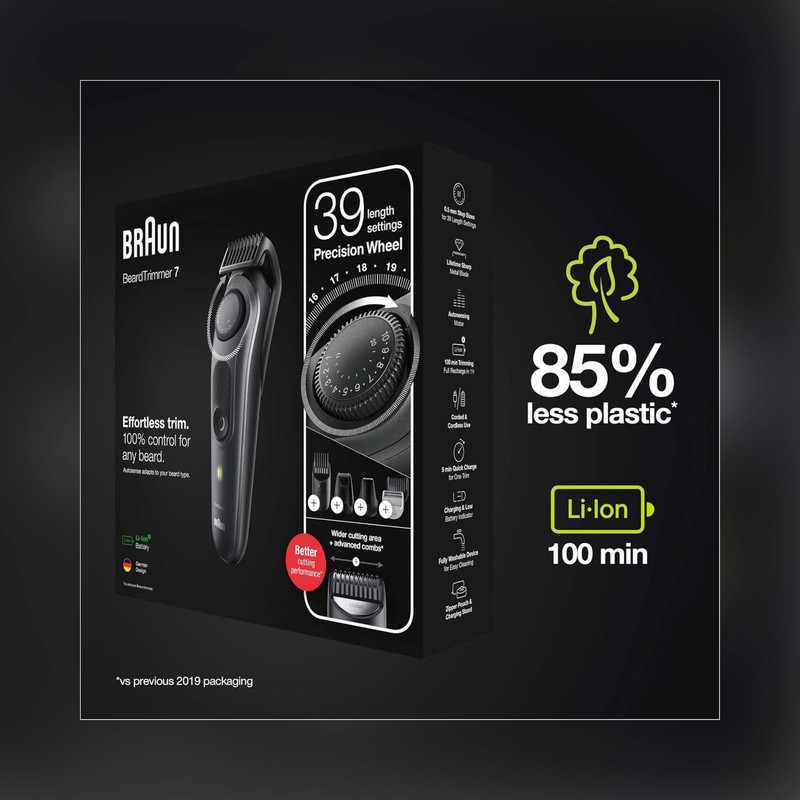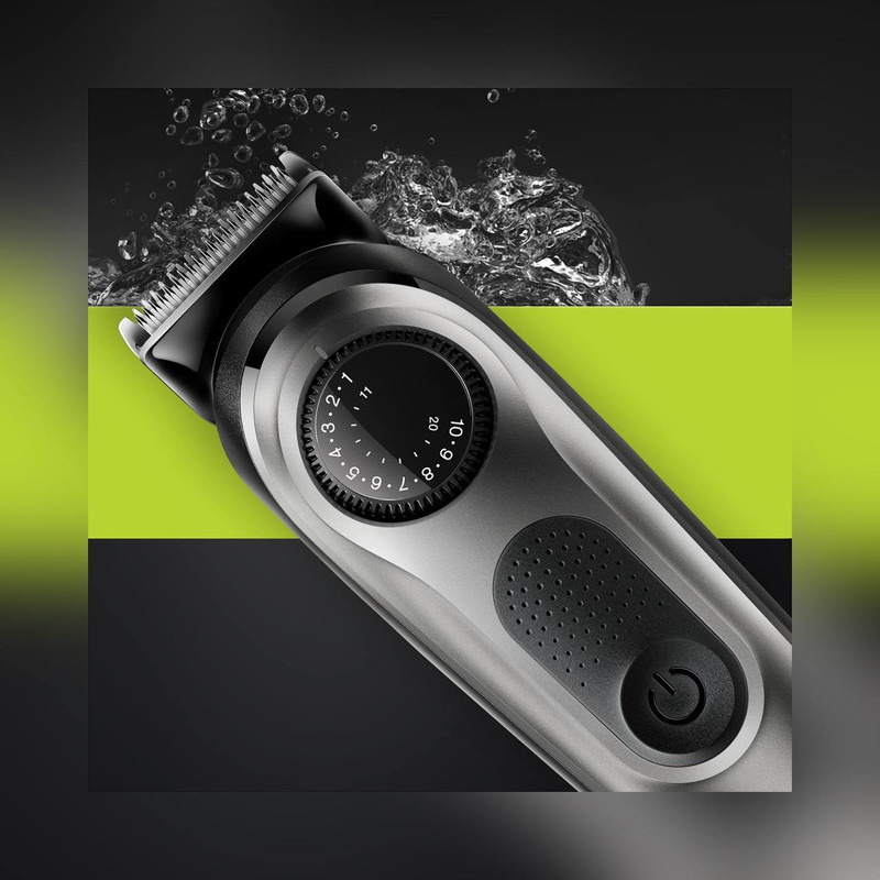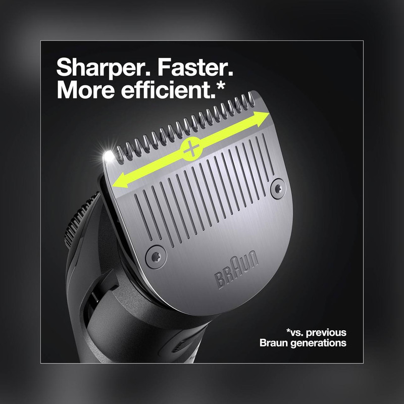 ماشین اصلاح صورت براون مدل BT7350(اروپا) کاملا ضد آب است که امکان اصلاح حتی در حمام را برای شما فراهم می کند و شستشوی دستگاه را بسیار آسان نموده است(easy clean).این مدل قابلیت اصلاح موی سر،صورت و بدن را دارد.با به کارگیری فناوری autosense و 13 برش در ثانیه اصلاح شما به صورت خودکار،منظم و یک دست خواهد بود همچنین قدرت موتور را بر اساس ضخامت مو تنظیم می نماید و عملکرد بی سابقه ای نسبت به نسل های قبلی براون ارائه می کند.شانه دستگاه پلاستیک کمتری نسبت به نسل های قبلی دارد(20 درصد) و تیغه های بیشتری در آن به کار گرفته شده،که سطح بیشتری از صورت شما را پوشش می دهد و اصلاح را بسیار آسان تر می نماید.دارای قابلیت prowheel که با استفاده از آن می توانید شماره اصلاح خود را با حساسیت نیم میلی متری (39 شماره) از 0 تا 20 میلی متر تنظیم نمایید.دارای باطری بسیار قوی از سری Li-Ion که با یک مرتبه شارژ کامل می توانید 100 دقیقه از آن استفاده کنید(زمان مورد نیاز برای شارژ کامل 1 ساعت)و با قابلیت شارژ سریع می توانید با 5 دقیقه شارژ 15 دقیقه اصلاح نمایید.این مدل به صورت با سیم(اتصال مستقیم به برق) و بدون سیم قابل استفاده است.اصلاح موهای ضخیم همیشه سخت بوده اما با استفاده از تیغه های فولادی ضد زنگ در این مدل و فناوری life time sharp blade که باعث می شود تیغه ها به صورت مادام العمر احتیاجی به تیز شدن نداشته باشند،به راحتی موهای ضخیم را اصلاح کنید.یک نشانگر LED برای نمایش وضعیت شارژ و اتمام باطری روی دستگاه قرار گرفته است.اقلام همراه دستگاه شامل یک عدد شانه اصلاح برای 1 تا 10 میلی متر،یک عدد شانه اصلاح برای 11 تا 20 میلی متر، یک عدد ششانه مخصوص اصلاح شماره 1،یک عدد سری فویلی precision shaving برای جزئیات اصلاح،یک عدد سری precision trimming برای اصلاح دقیق و خط زن،برس تمیز کننده،کیف نگه دارنده و استند شارژ می باشد.گفتنی است برای کمک به محیط زیست بسته بندی این محصول از 75 درصد پلاستیک کمتر نسبت به مدل های قبلی تشکیل شده است.