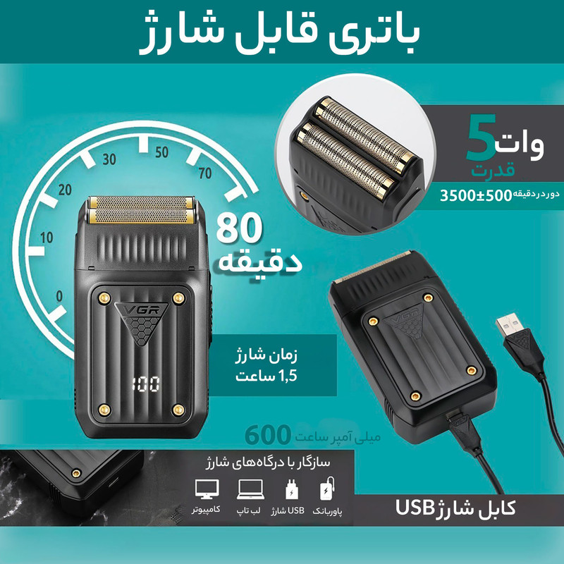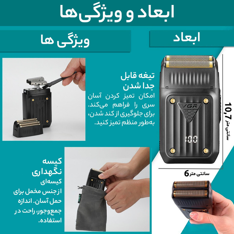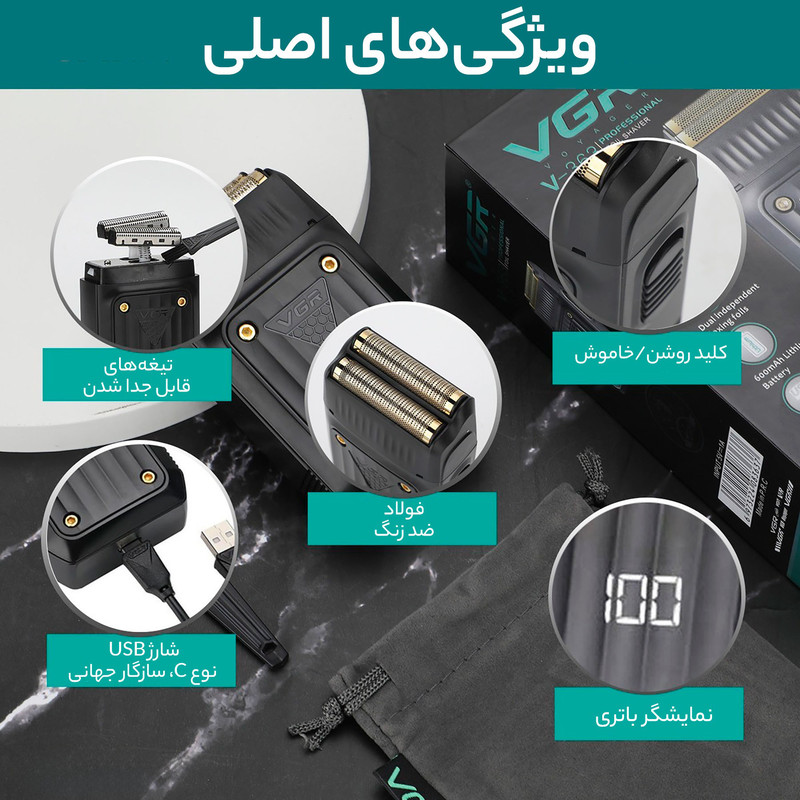 شیور V_363 از جدیدترین محصولات برند شناخته شده وی جی ار است .این مدل با طراحی خاص ، تیغه تیتانیوم ضد حساسیت و همچنین قیمت اقتصادی خود نسبت به دیگر مدل ها از همین برند ،گزینه خرید مناسبی برای استفاده شخصی و سالنی میباشد.